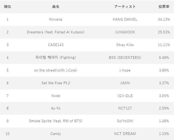 『IDOL CHAMP』内のファン投票では以下の結果となりました。