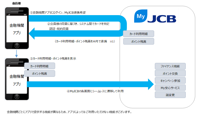 株式会社ジェーシービー(本社:東京都港区、代表取締役会長 兼 執行役員社長:二重 孝好、以下「JCB」)は、金融機関アプリへのログインのみで、カードご利用明細の確認や会員専用WEBサービス「MyJCB」上の各種手続きを実施できるようになる新サービス「MyJCB連携機能サービス」の提供を開始いたしました。