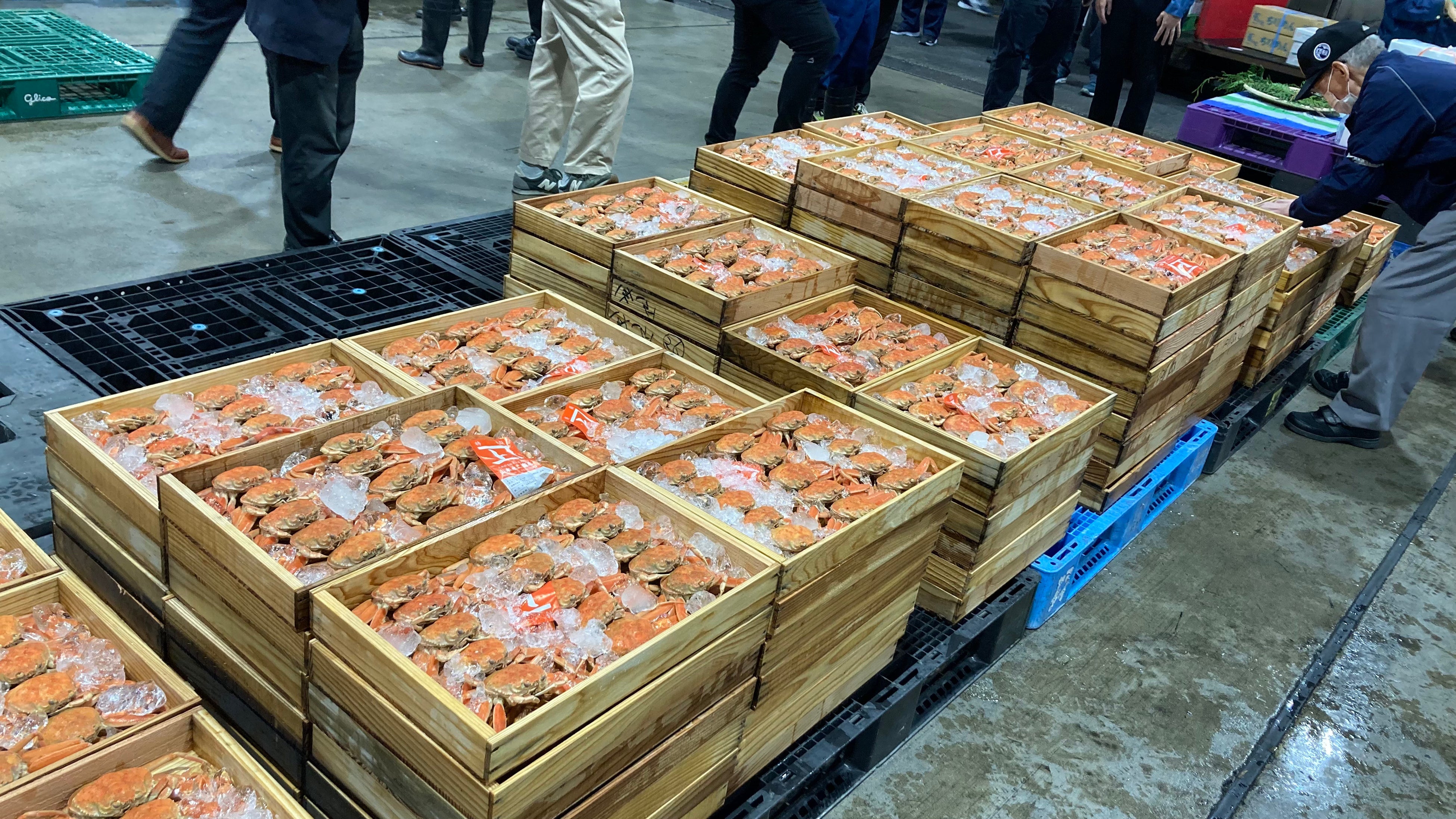 大阪中央卸売市場で初競りにかけられた「松葉ガニ」。