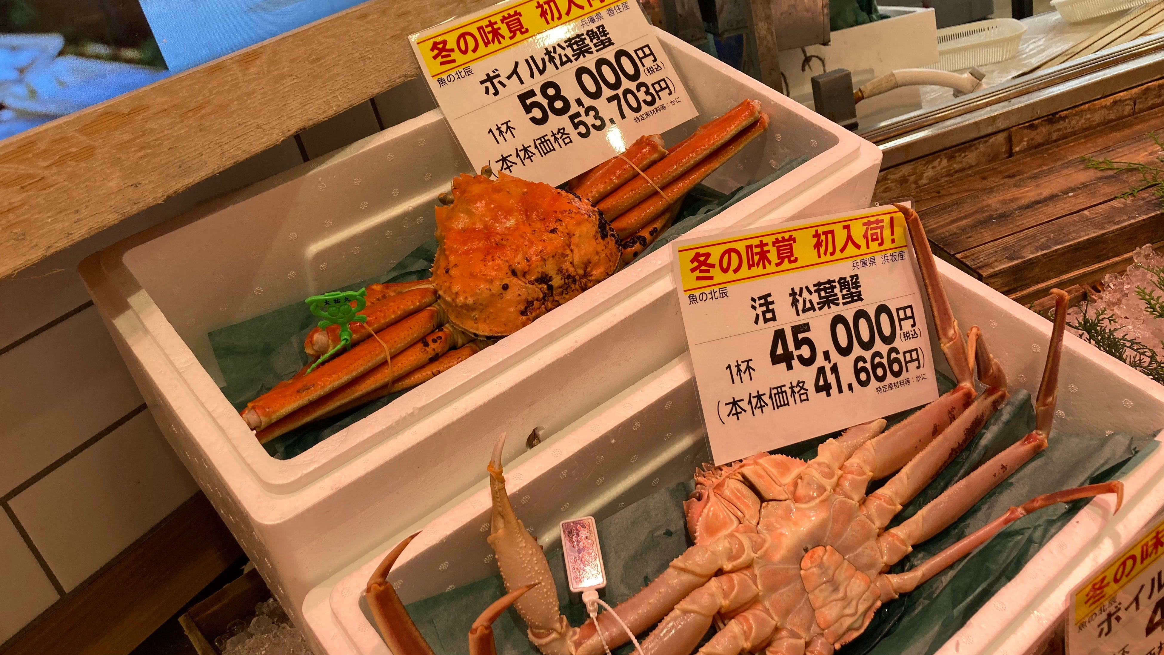「松葉ガニ」浜坂漁港 活け1杯45,000円、香住漁港 ボイル1杯58,000円