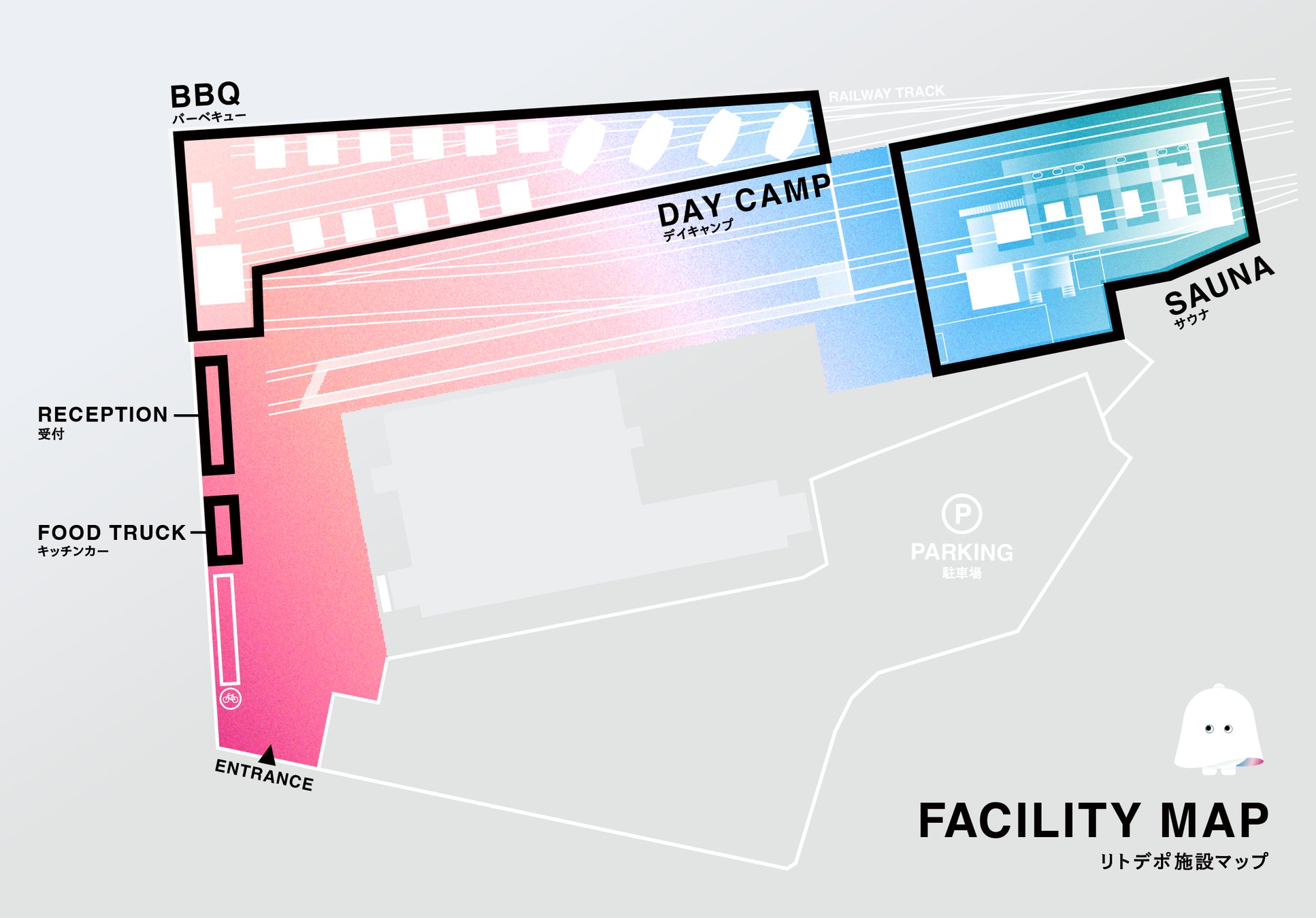 JR東日本の旧・大宮運転区跡地にオープンする、サウナ・キャンプ・BBQが線路敷で気軽に楽しめる新複合アウトドア施設です。廃レールや点検設備を景観に活かした、ここでしか体験できないユニークな雰囲気の中で、隣を走る在来線・新幹線を眺めながらアウトドア体験ができます。