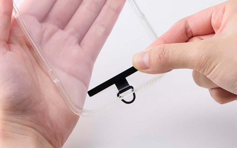 ケースにフィットする0.2mmの薄型ストラップホールシートが付属。ケースにストラップホールがなくても、スマートフォンとケースの間に挟むだけで使用できます。