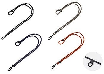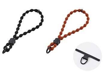 特許取得の「こぶ型ひも」は、モコモコの形状とやわらかい伸縮素材により手首や肩への負担をやさしく分散し、肌への密着も抑えるため、長時間でもさらっと快適にお使いいただけます。また、スマホケースにストラップホールがない場合でも、ケースとスマートフォンの間に挟むだけで使用できる、耐久性の高いステンレス製の薄型ストラップホールシートが付属します。