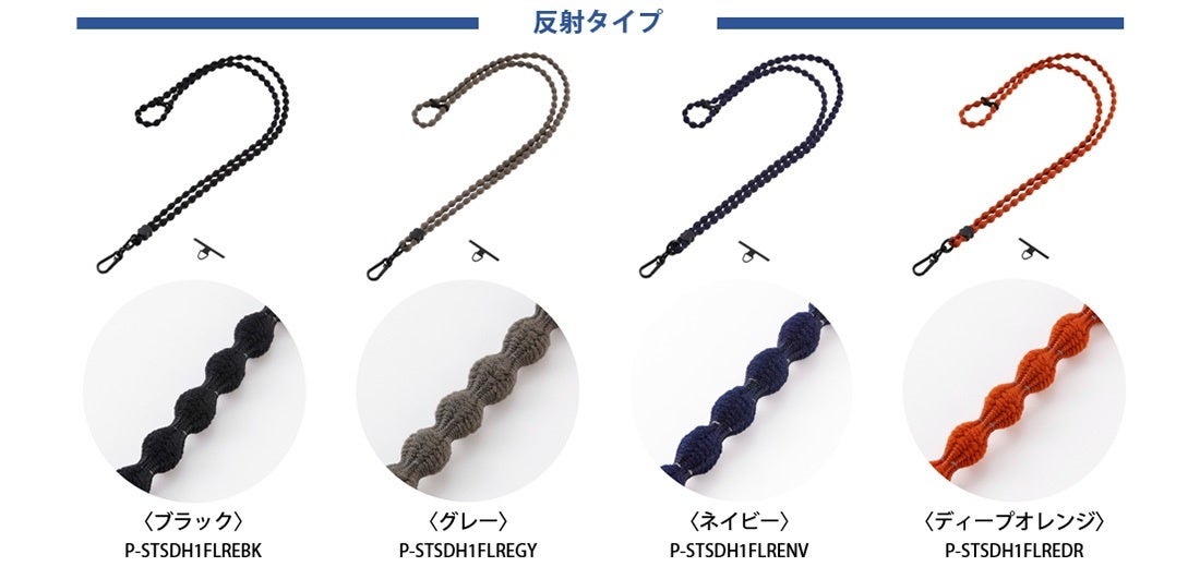 ハンドストラップとショルダーストラップの2種類、それぞれにデザイン柄タイプと反射糸を採用した反射タイプをラインアップしています。