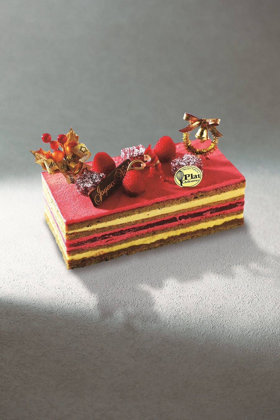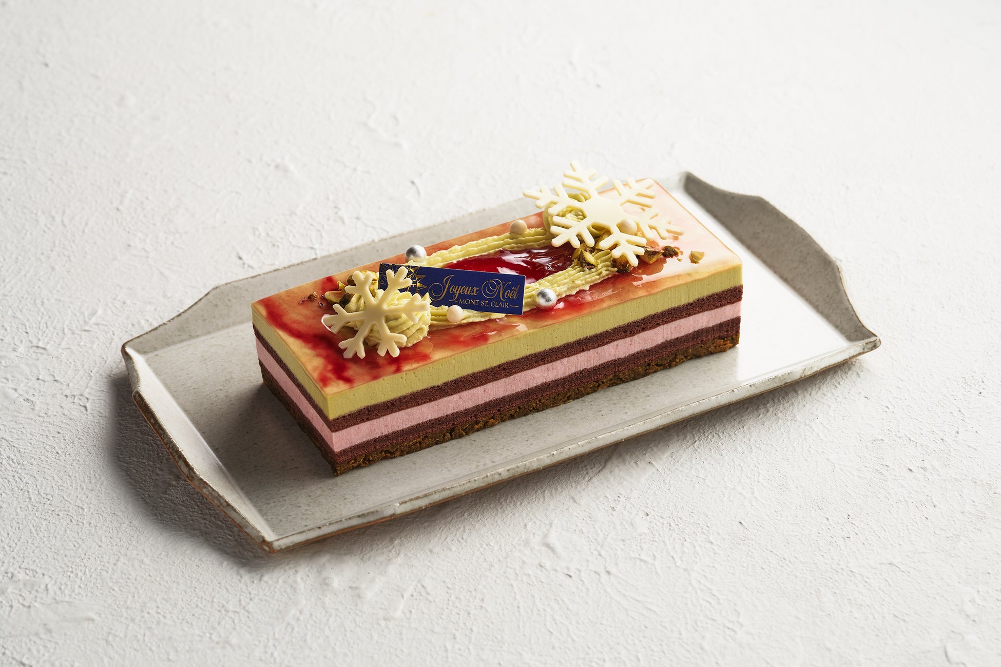 クリスピーでサクサクな食感のピスタチオ生地に、三重県の契約農家の苺「よつぼし」のムースやショコラのビスキュイを重ね、クリスマスカラーで華やかにさらにナッツをふんだんに使ったチョコレートのバーを飾り豪華な装いに。