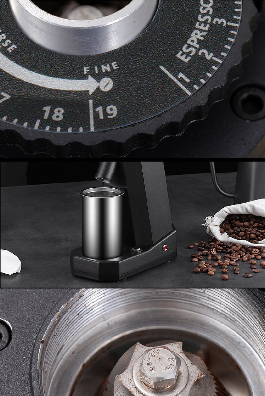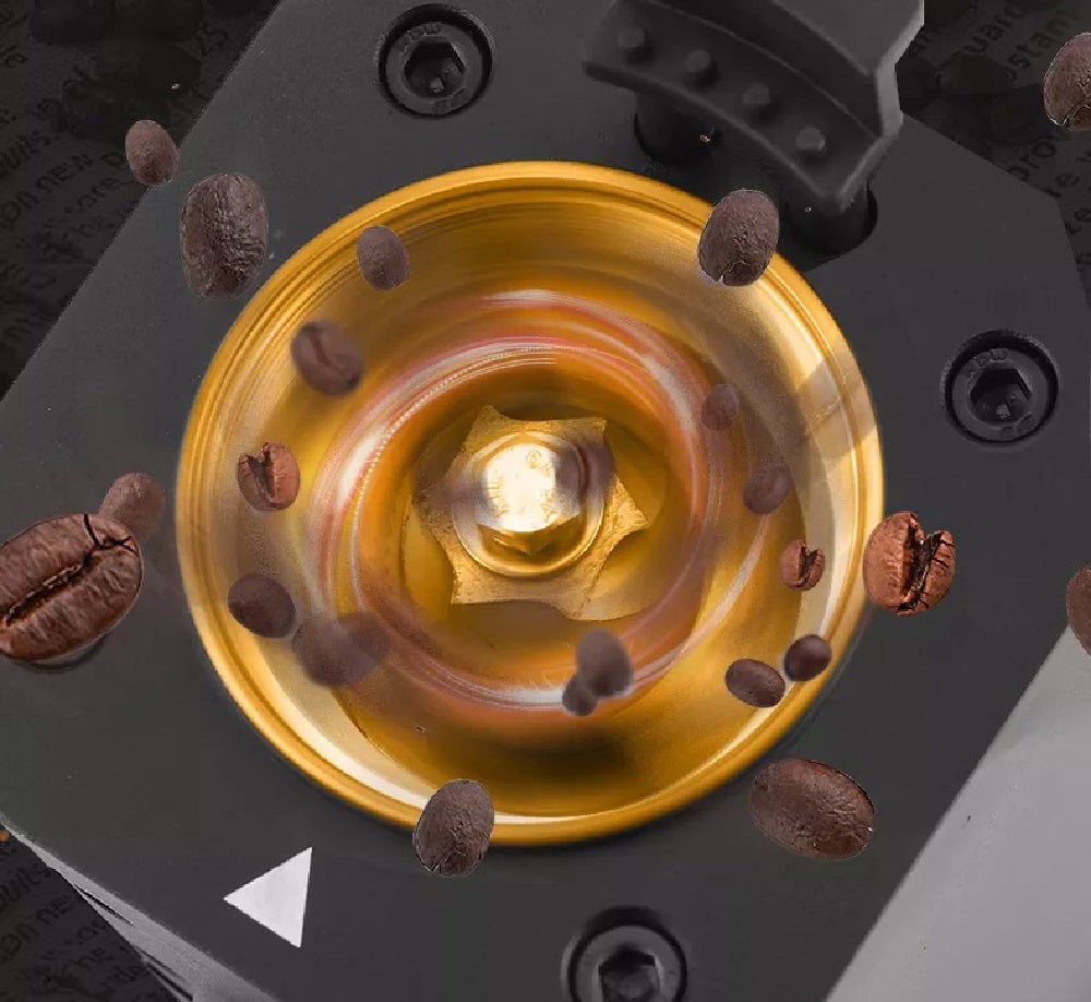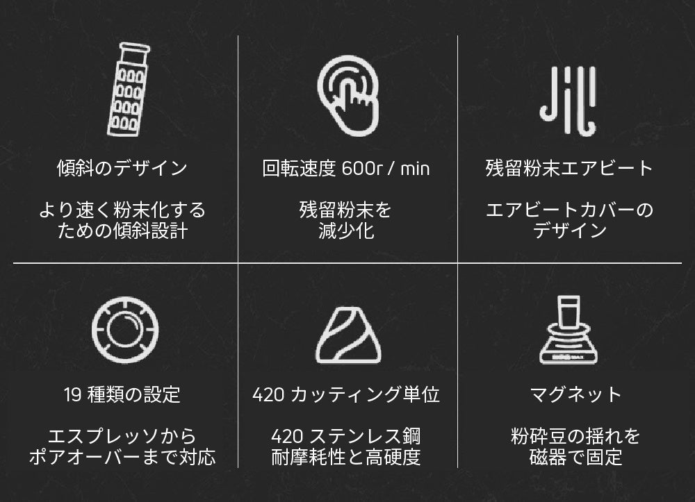 40mmチタン合金とコーン式グラインドによって、低速回転によって摩擦熱が発生しにくく、高い精度の粉末で豆の風味を損なわないように配慮した仕様です。