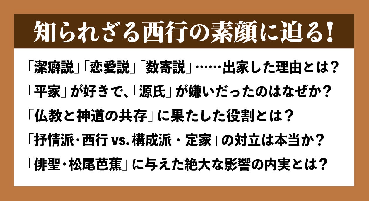 『新古今和歌集』に最多の94首が撰入された歌人としての西行はもちろん、「旅」「桜」「道の思想」「仏教と神道の共存」など文化史における西行の知られざる事績を分かりやすく紹介してくれる一冊です。