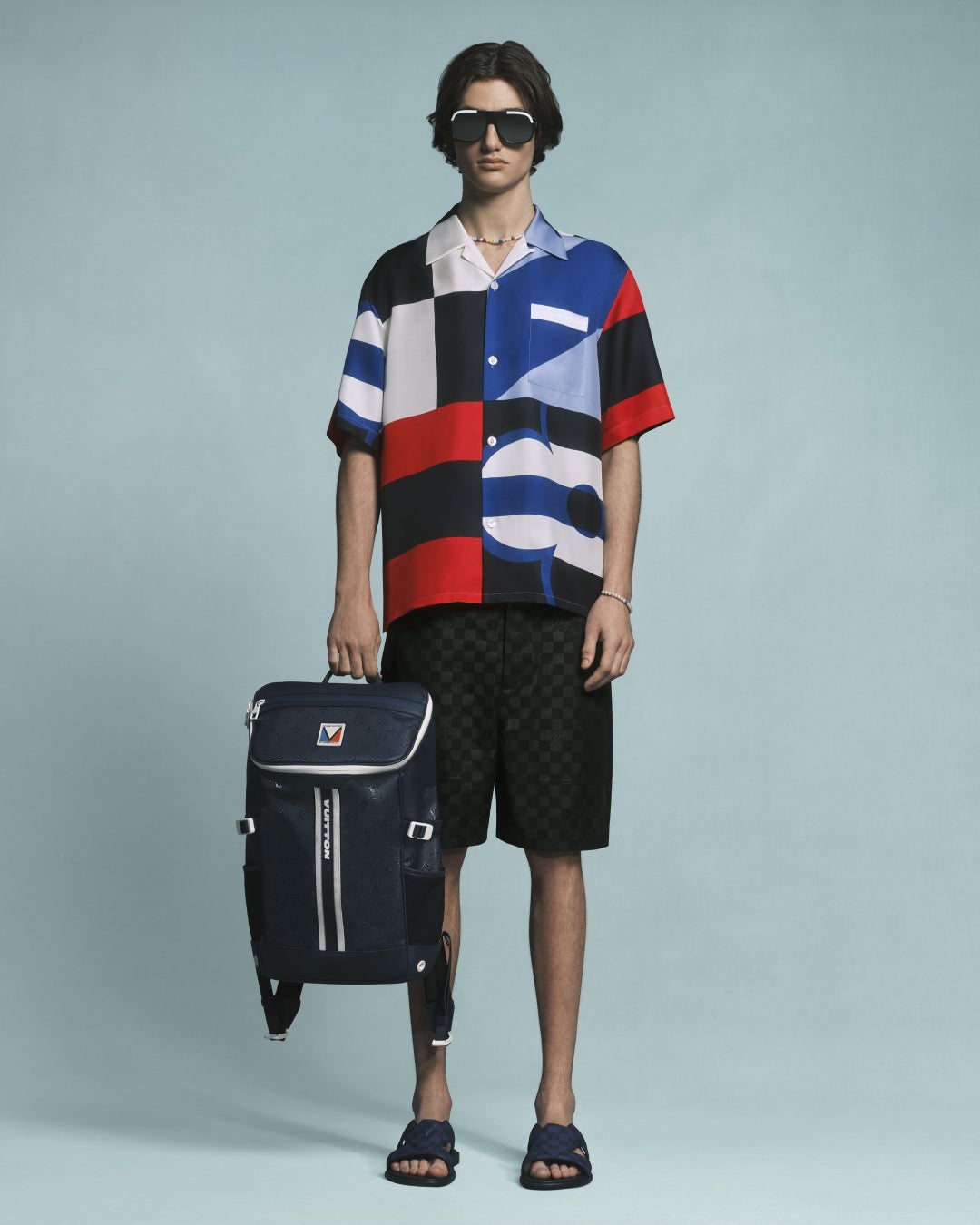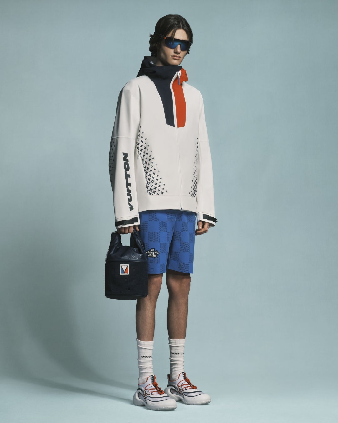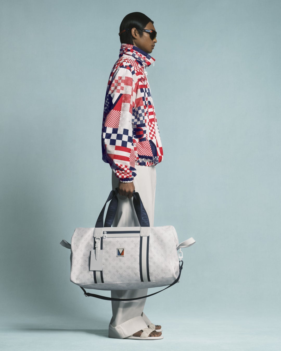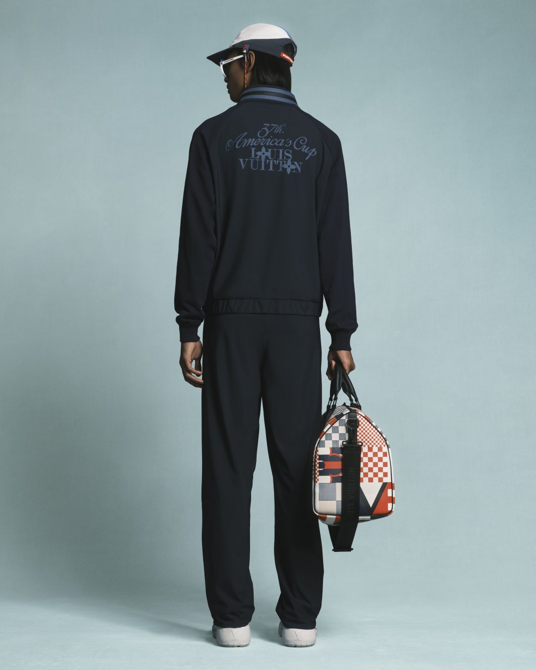 本大会を記念して、ルイ·ヴィトンでは、世界最高峰のセーリングレガッタの感動とエネルギーを余すところなく表現したメンズとウィメンズのプレタポルテ、レザーグッズ、アクセサリーを発表。メゾンのエンブレムに大胆なカラーと海をイメージしたディテールを掛け合わせたデザインが特徴の同コレクションは、テクニカルなアイテムが揃う「Riding the Waves(ライディング·ザ·ウェイブズ)」、スポーティなデイウェアライン「A Day on the Deck (ア·デイ·オン·ザ・デック)」、そしてイブニングウェアラインの「Elegant Summer Evening(エレガント·サマー·イブニング)」という3つのテーマで展開。鮮やかでダイナミックなアメリカズカップのロゴは、ガストン-ルイ·ヴィトンが考案したシグネチャーコードである歴史的なグラフィック「V」をレッド、ホワイト、ネイビーのカラーブロックで縁取ったデザインで、コレクション全体に渡り登場するモチーフです。