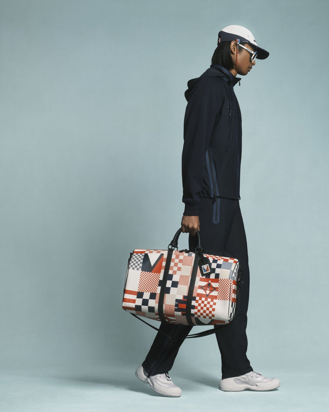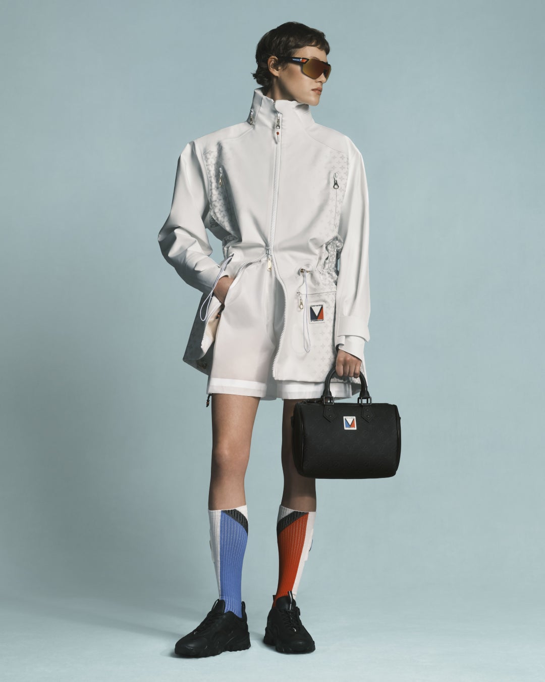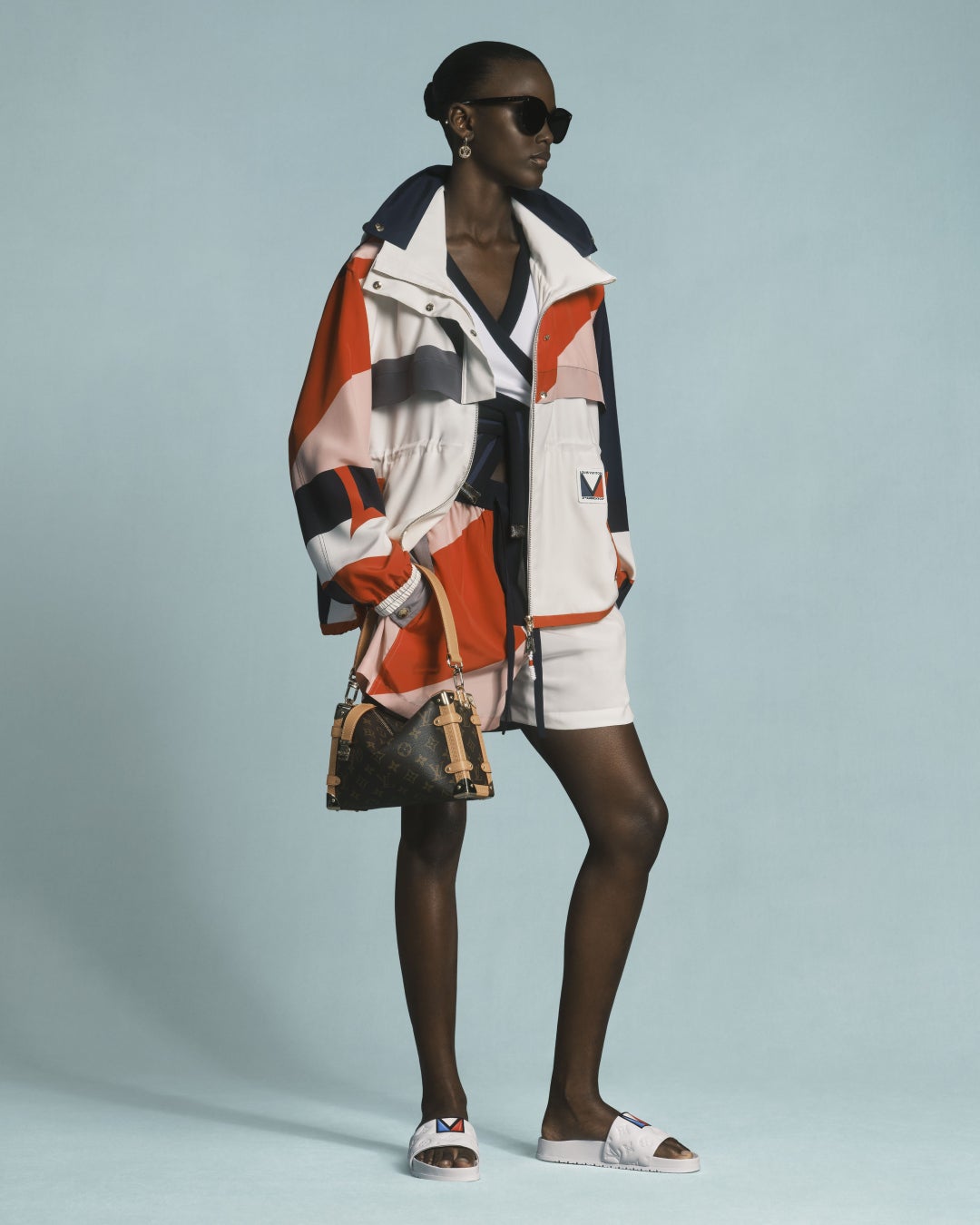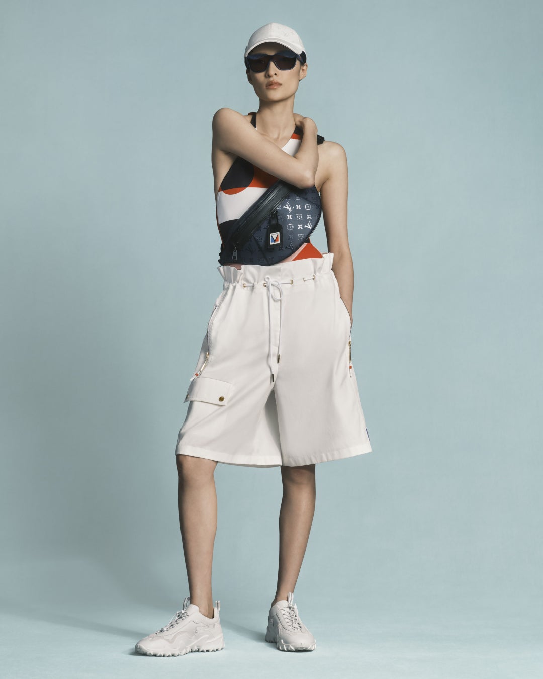 本大会を記念して、ルイ·ヴィトンでは、世界最高峰のセーリングレガッタの感動とエネルギーを余すところなく表現したメンズとウィメンズのプレタポルテ、レザーグッズ、アクセサリーを発表。メゾンのエンブレムに大胆なカラーと海をイメージしたディテールを掛け合わせたデザインが特徴の同コレクションは、テクニカルなアイテムが揃う「Riding the Waves(ライディング·ザ·ウェイブズ)」、スポーティなデイウェアライン「A Day on the Deck (ア·デイ·オン·ザ・デック)」、そしてイブニングウェアラインの「Elegant Summer Evening(エレガント·サマー·イブニング)」という3つのテーマで展開。鮮やかでダイナミックなアメリカズカップのロゴは、ガストン-ルイ·ヴィトンが考案したシグネチャーコードである歴史的なグラフィック「V」をレッド、ホワイト、ネイビーのカラーブロックで縁取ったデザインで、コレクション全体に渡り登場するモチーフです。