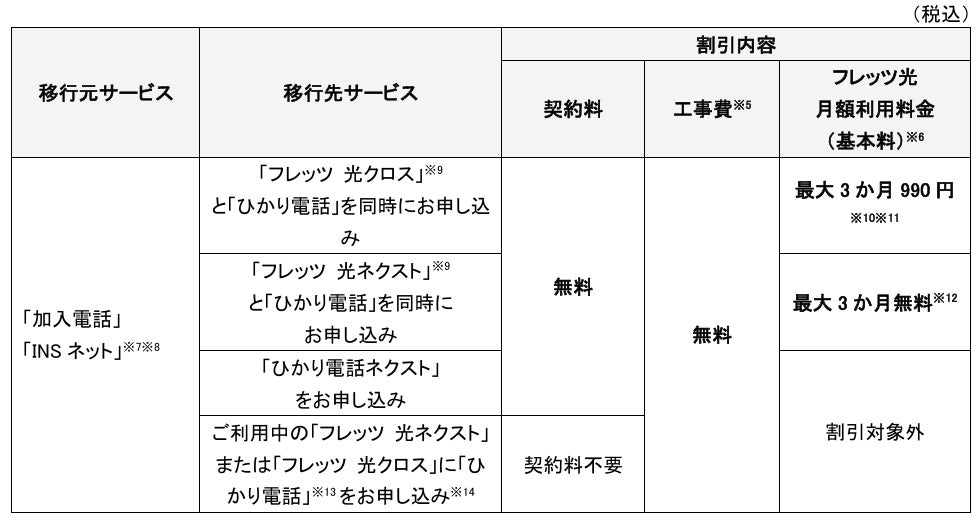 「加入電話」「INSネット」から「フレッツ光」と「ひかり電話」または「ひかり電話ネクスト」への移行工事費割引等の実施について