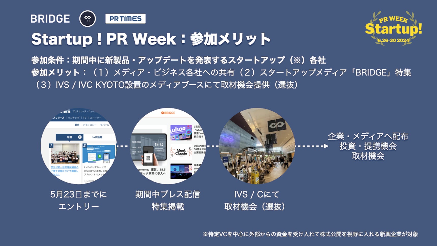 エントリー情報はスタートアップメディアBRIDGEにて特集掲載(※)いたします。また、期間中に開催されるIVS2023 KYOTO / IVS Crypto 2023 KYOTOに参加される企業の方についてはIVSと連携し、Startup!PR Week参加企業であることがわかる工夫をする予定です。投資家や事業会社、メディアなどキーマンが集まる場所で、新製品発表の話題を効果的にステークホルダーに届けるお手伝いをさせていただきます。