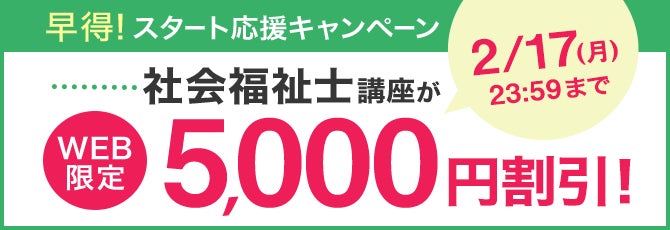 株式会社ユーキャンでは、1月31日(金)より「早得!スタート応援キャンペーン」を開始しました。2月17日(月)まで、WEBからの受講お申込み限定で社会福祉士講座の受講料を5,000円割引いたします。