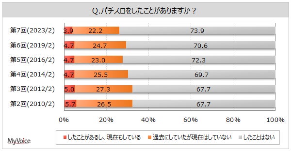 | <今 回>(2023/2)https://myel.myvoice.jp/products/detail.php?product_id=29510 ※上記設問の他に「パチンコ店の利用頻度」も聞いています。 <第6回>(2019/2)https://myel.myvoice.jp/products/detail.php?product_id=24711 <第5回>(2016/2)https://myel.myvoice.jp/products/detail.php?product_id=21115 |