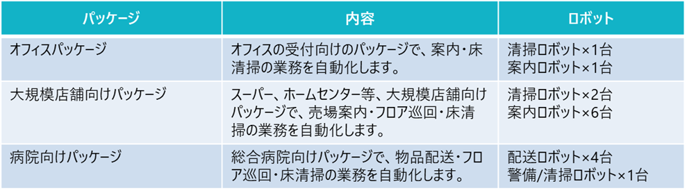 まずは、オフィスの受付業務向け「オフィスパッケージ」と、売場の広い店舗やショッピングモール向け「大規模店舗向けパッケージ」、「病院向けパッケージ」を提供し、今後、パッケージの種類を増やしていきます。