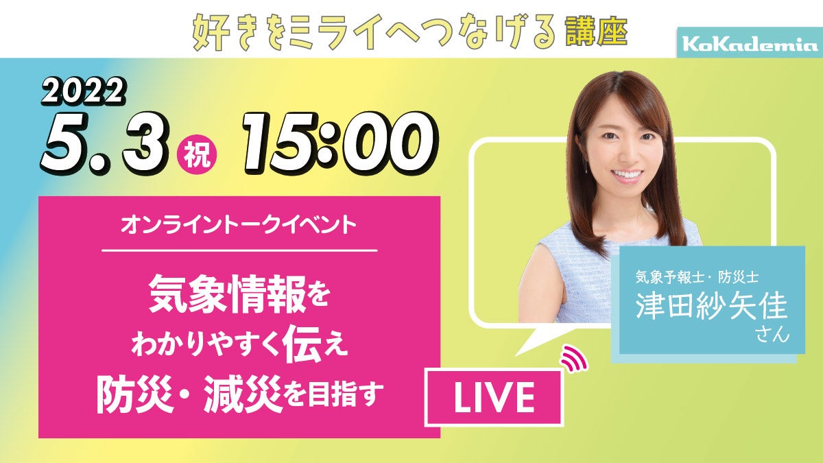 テレビや講演会、書籍の執筆など幅広く活躍している気象予報士・防災士の津田紗矢佳さん。「気象災害の被害者をひとりでも減らしたい」という気持ちから、気象情報を誰もがイメージできるように伝える「気象翻訳」の技術を日々磨いています。気象予報士になりたい人はもちろん、空や雲が好き、防災について知りたいという人にも聞いてほしい、気象や防災の最前線のお話をたっぷり語ります。