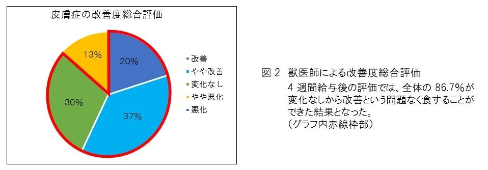 また、獣医師が総合的に評価した皮膚症状の改善度は、全体の56.7%が「改善」・「やや改善」、30.0%が「変化なし」、13.3%が「悪化」でした。「改善例」と「変化なし」を合わせて、86.7%の犬が問題なく食べることができたという結果となりました(図2)。