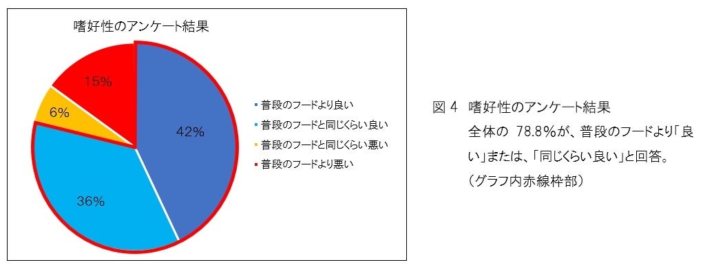 また、飼い主へのアンケートによる嗜好性の調査では、42.4%が普段のフードよりも良いと評価しました(図4)。