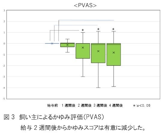 その結果、かゆみスコアは、給与前と比較し、給与2週間後から有意に減少し、経時的に減少する傾向が見られました(図3)。