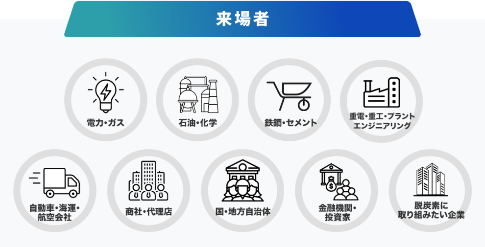 来場者の例:電力・ガス、石油・化学、鉄鋼・セメント、重電・重工・プラントエンジニアリング、自動車・開運・航空会社、商社・代理店、国・地方自治体、金融機関・投資家、脱炭素に取り組みたい企業 他・・