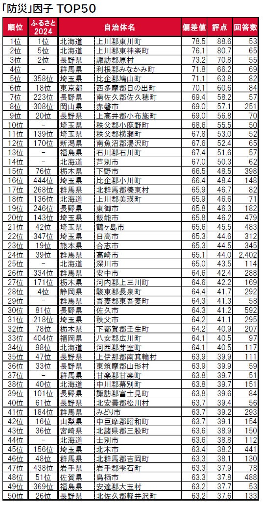 ●「防災」因子は、1位北海道上川郡東川町、2位北海道上川郡東神楽町、3位長野県諏訪郡原村です。トップ2の自治体は、北海道上川郡に属する町となっています。