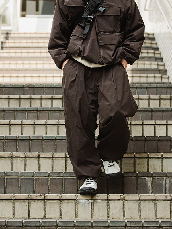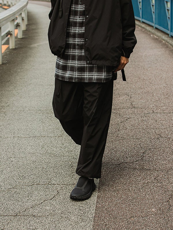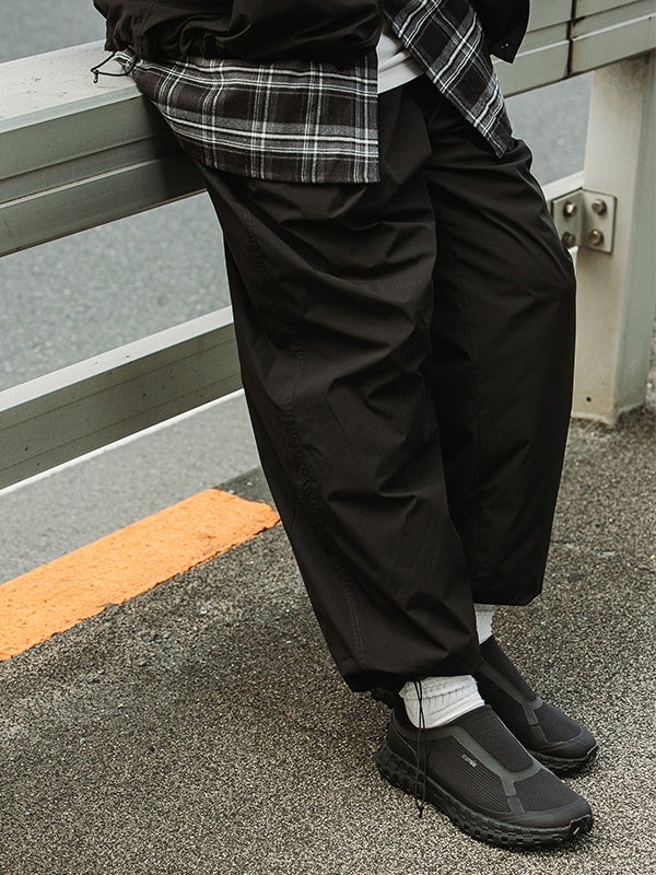 イージー仕様で気軽に着用できる機能性トラウザー。ウエストに挟み込んだハンギングループはギアやガジェットを引っ掛けておくのに便利なディテールです。裾のドローコードでシルエットの調整が可能です。