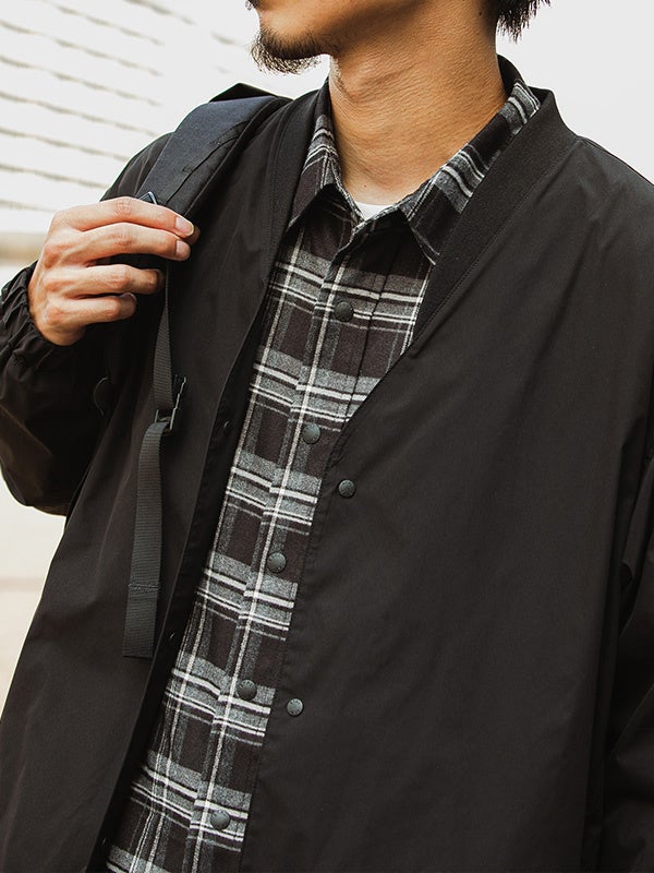 ドットボタンアップのスタンドネックプルオーバー。ゆったりとしたシルエットに総裏メッシュ素材仕様になっているので、肌離れも良く快適な着心地です。