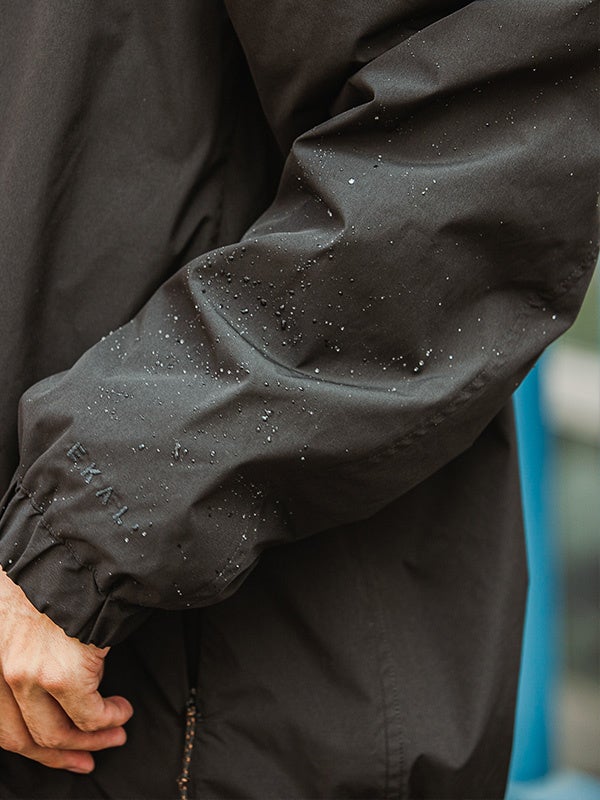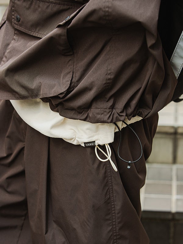 ドットボタンとメッシュのポケット袋布がアウトドア仕様。裾はドロスト仕様で合わせるアイテムによっても変化がつけられます。EKALオリジナルコードの襟吊りを施しています。
