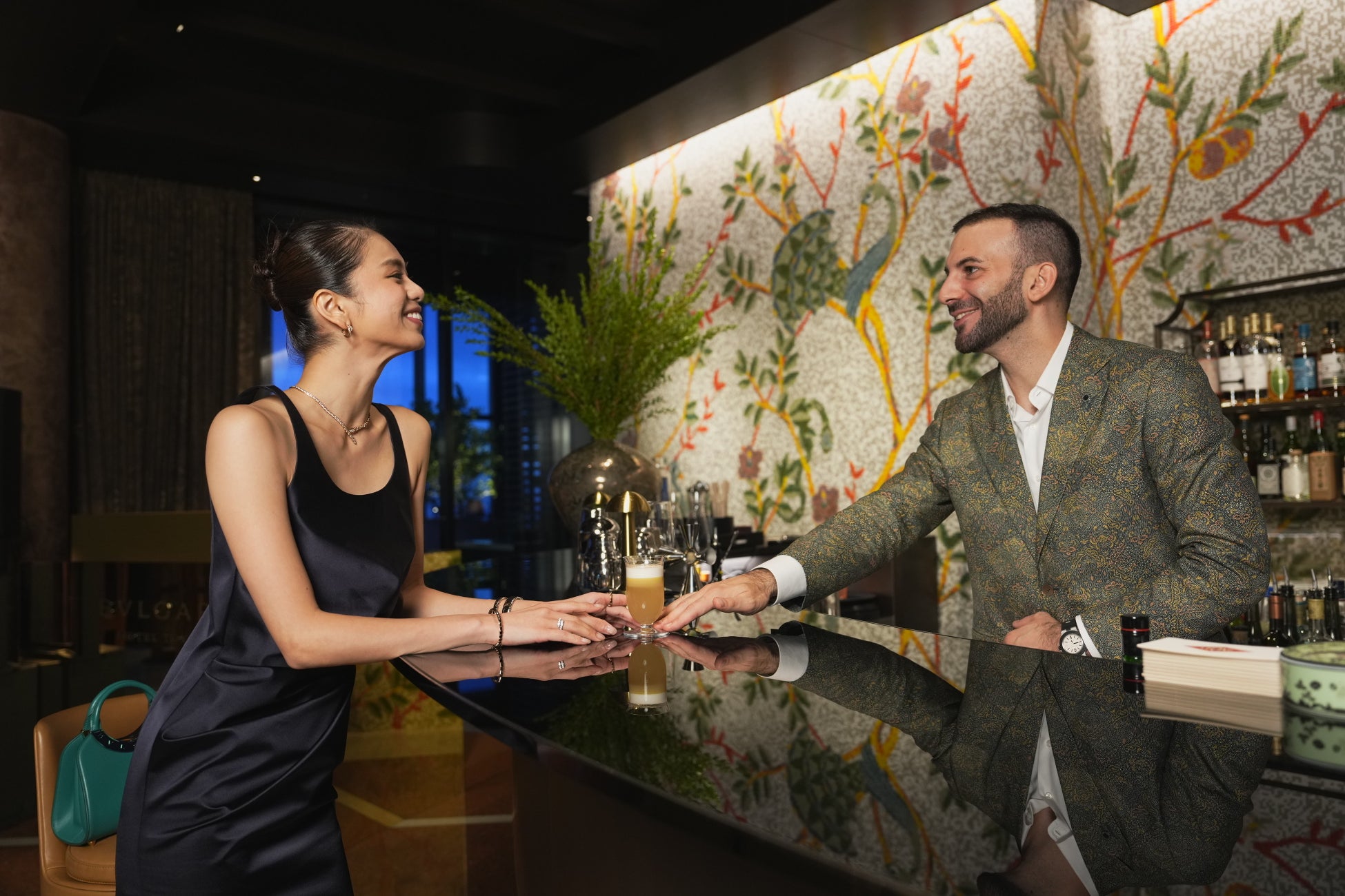 2023年4月のオープン以降、東京の新たなデスティネーションとして高い注目を集めている「ブルガリ バー」のなかでも、特にアイコニックな美しいモザイク画を背景に、香港の「バー・レオーネ」の創業者であるロレンツォ・アンティノーリ氏と「ブルガリ バー」バー マネージャーのアンドレア・ミナレッリがイベントのために創作されたオリジナルカクテルを皆様にお楽しみいただきました。