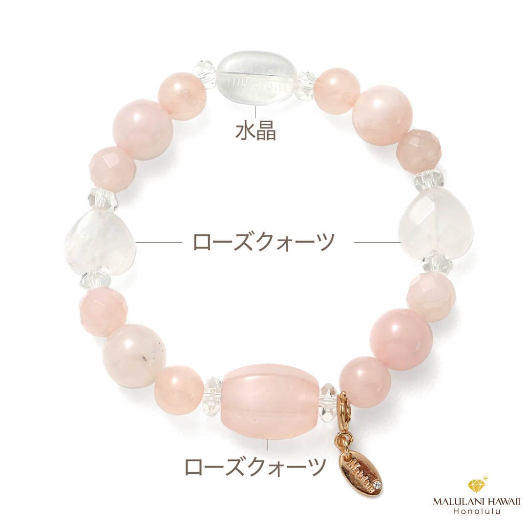 愛と美の女神を象徴するローズクォーツを、ハートやラウンド、タンブルなど、様々なカットストーンで組み上げた、ローズクォーツを満喫できるブレスレット。
