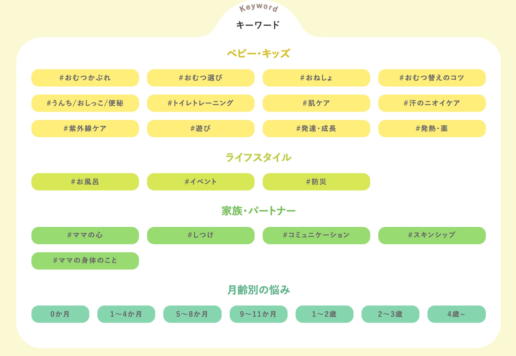 「ベビー・キッズ」「ライフスタイル」「家族・パートナー」「月齢別の悩み」といったテーマ別の入口から、#おむつ選び、#おむつかぶれ、#トイレトレーニング、#お風呂、#遊び といった、具体的なキーワードで知りたい情報を効率的に探せるようになっています。