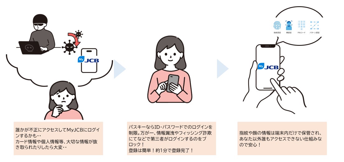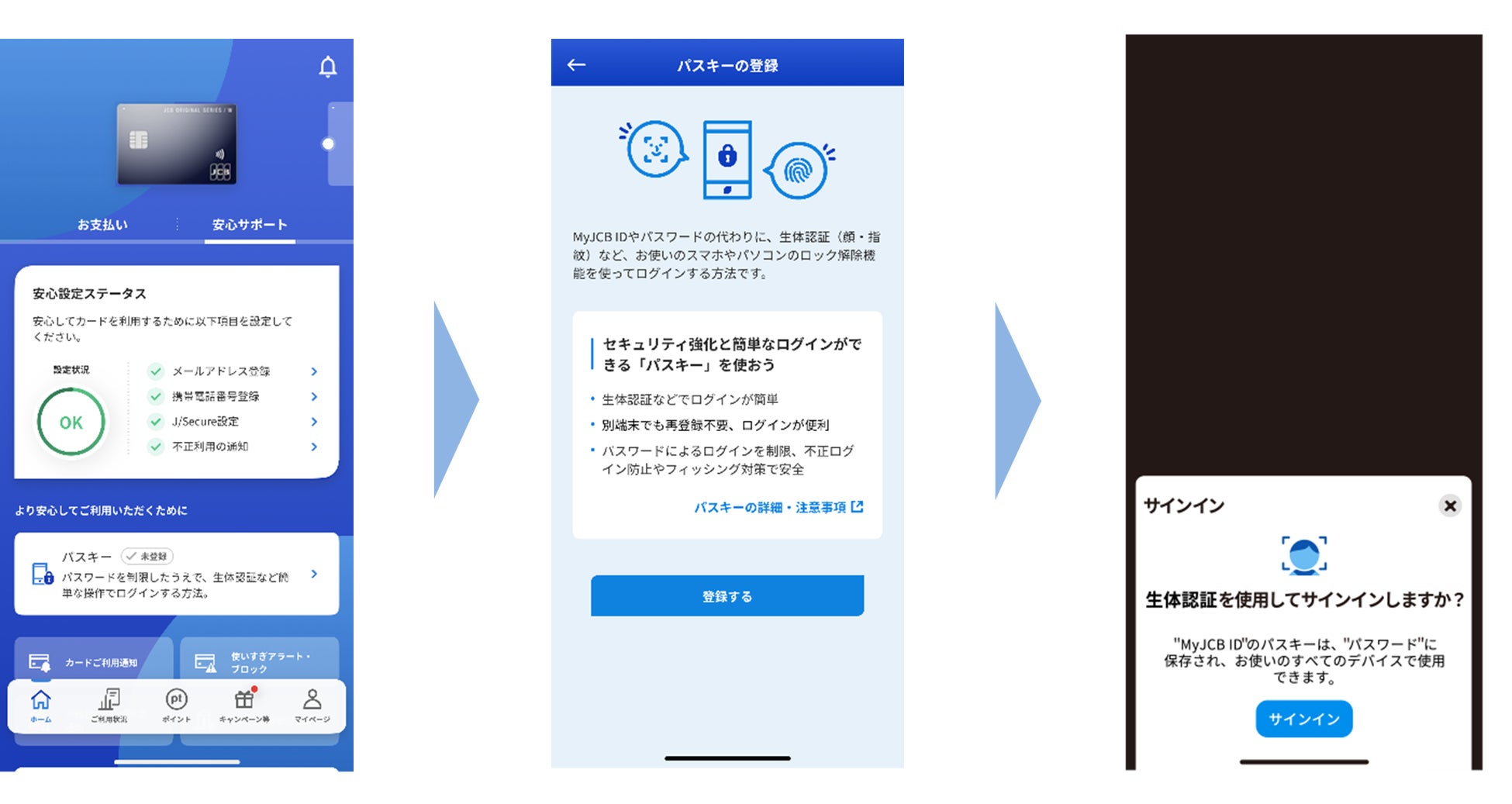 株式会社ジェーシービー (本社:東京都港区、代表取締役会長 兼 執行役員社長:二重 孝好、以下:JCB)は、会員専用WEBサービスMyJCBの新しいログイン認証方法として「パスキー」を導入しました。