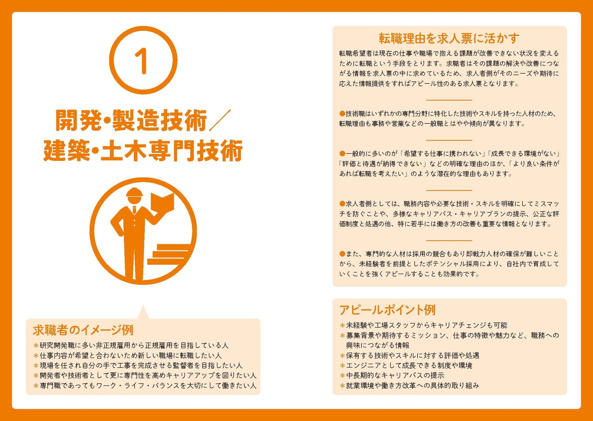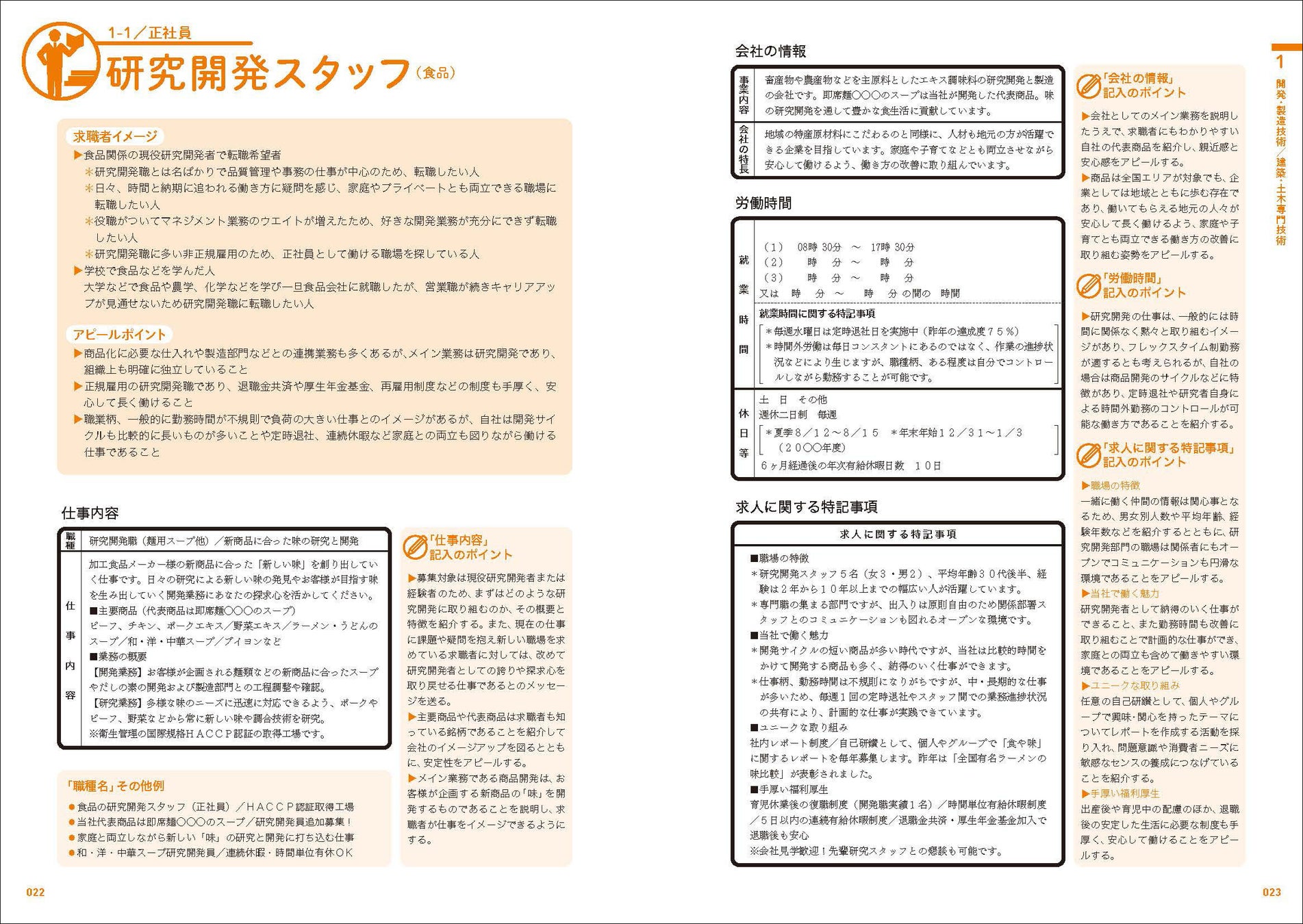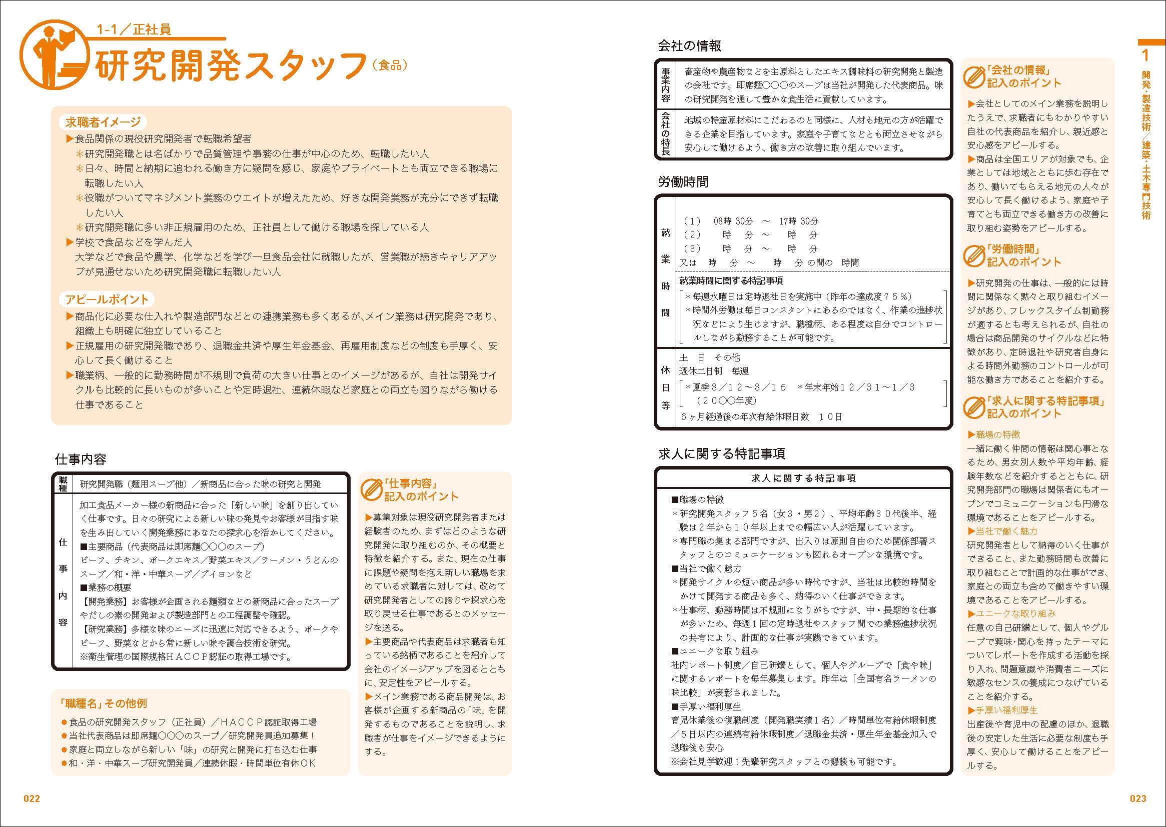 本書のサンプル求人記入例は、まずは応募の可能性のある求職者を「求職者イメージ」として想定。異業種からの転職希望者や現職で働き方などに課題を抱えた若手など、職種ごとにイメージする求職者が知りたい情報や、求職者に合った自社の強みや魅力などをアピールポイントとして整理してあるので、自社での求人票作成に活用できる。