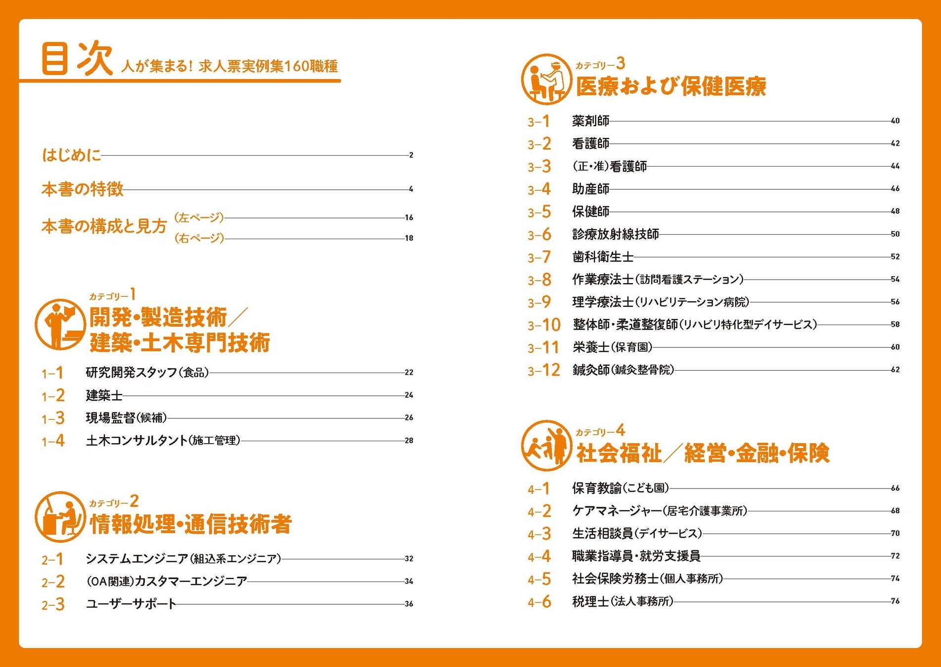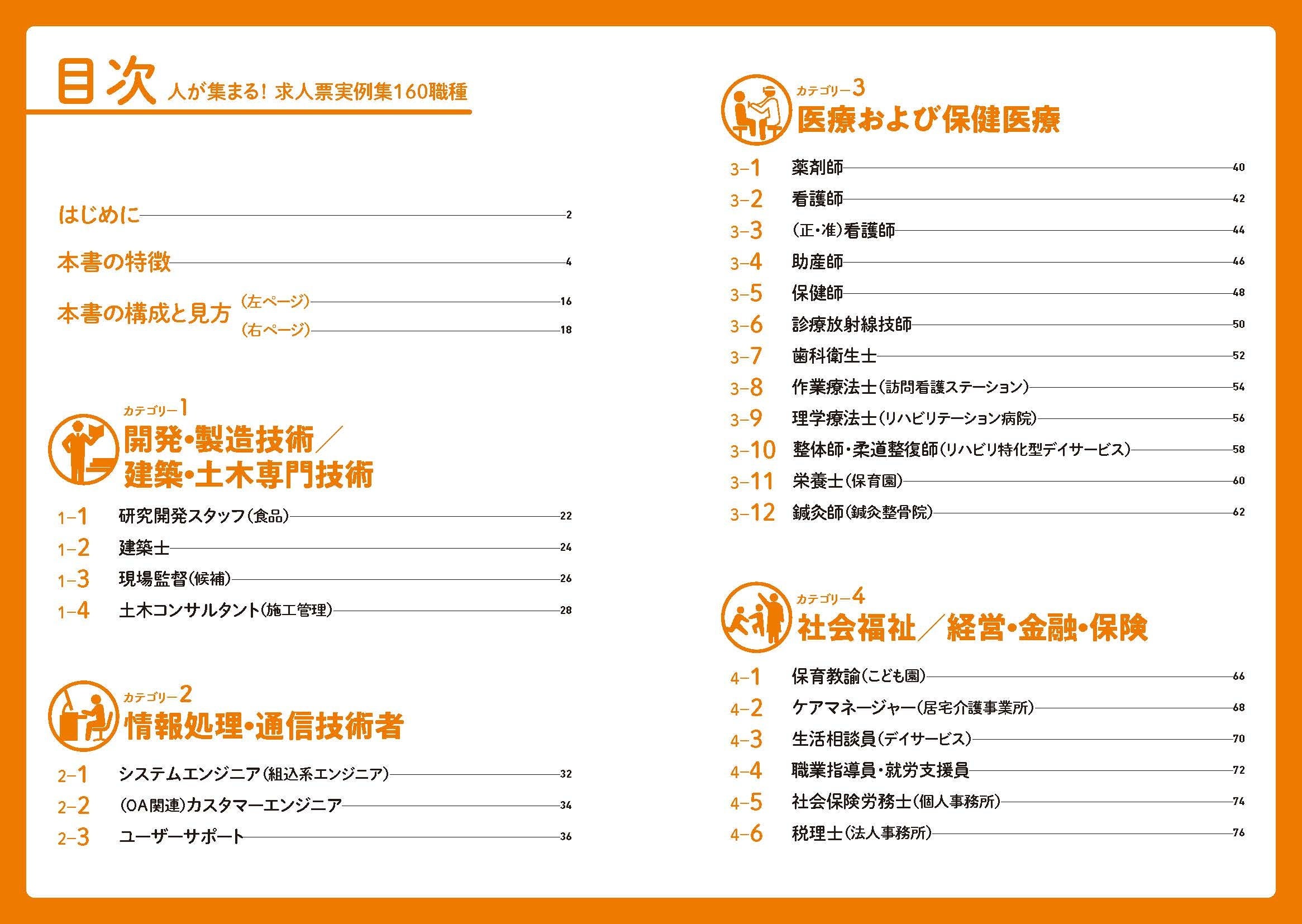 求人ハウツー本は数多く出版されているが、経営者や採用担当者にとって、理論や重要ポイントは理解できても、実際に自社の求人票として形に落とし込むことは別の話。本書は、そうした読者のニーズに合わせて、実際の求人票にそのまま活用できる、あるいは自社用にアレンジできるリアルなサンプルを16カテゴリー160職種について提供。