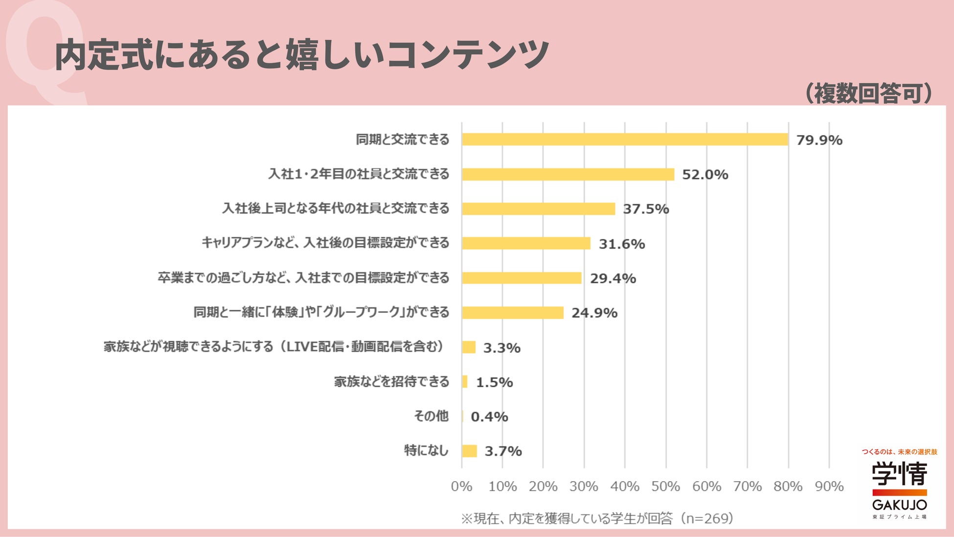 内定式にあると嬉しいコンテンツは、「同期と交流できる」79.9%が最多でした。次いで、「入社1・2年目の社員と交流できる」52.0%、「入社後上司となる年代の社員と交流ができる」37.5%、「キャリアプランなど、入社後の目標設定ができる」31.6%が続きました。「同期とは入社前から親睦を深めておきたい」「これから一緒に働く人と交流することで、入社後の不安が解消できそう」「同期や先輩社員と交流することで、入社までのモチベーションを上げたい」などの声が上がっています。