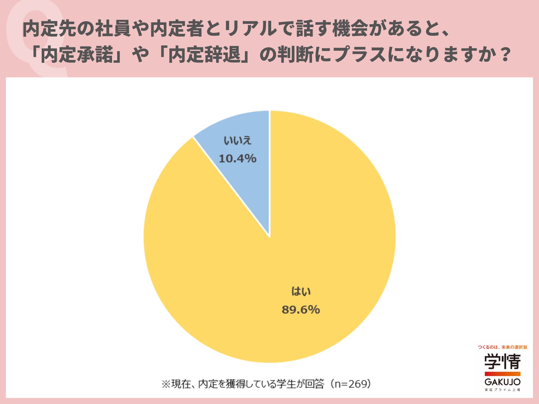 社員や内定者同士で直接話す機会があると、「内定承諾」の判断にプラスになると回答した学生が89.6%に上りました。約9割の学生が、リアルで社員や内定者と話す機会があると、内定承諾の判断の後押しになるとしています。「選考中は聞けなかったことや疑問点を解消することで、入社前後のギャップをなくすことができそう」「社風を掴むことができるので、入社後のことをイメージしやすいと思う」「実際に、直接話ができる機会をいただいたことで、内定先への志望度が向上した」といった声が上がりました。