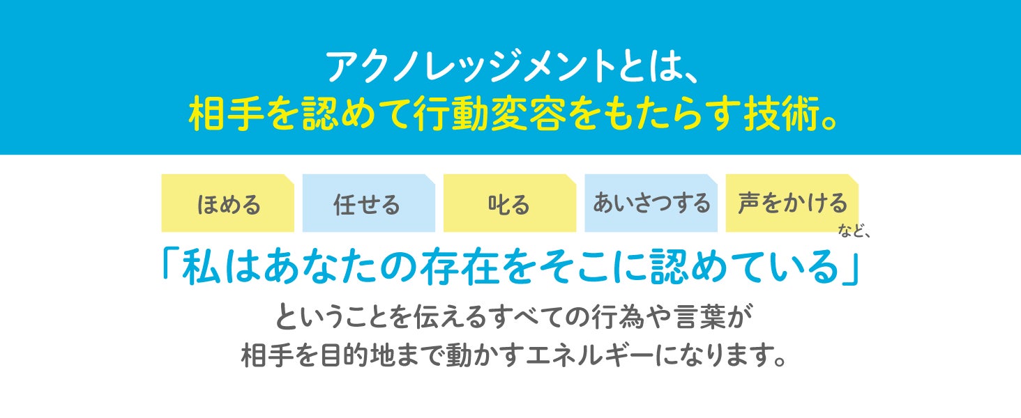 アクノレッジメントにあたるのは、ほめる、任せる、叱る、あいさつする、声をかけるなど、「私はあなたの存在をそこに認めている」ということを伝えるすべての行為、言葉。