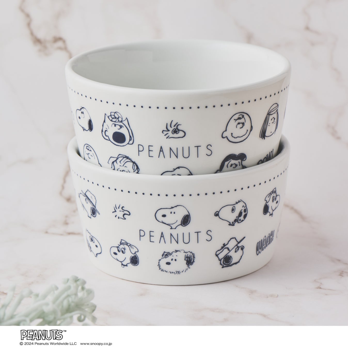 表情豊かなキャラクターたちの絵柄が最大の魅力です。2個のボウル皿はそれぞれ異なる絵柄で、ひとつにはピーナッツの仲間たちを、もうひとつにはスヌーピーときょうだいたちをプリントしました。