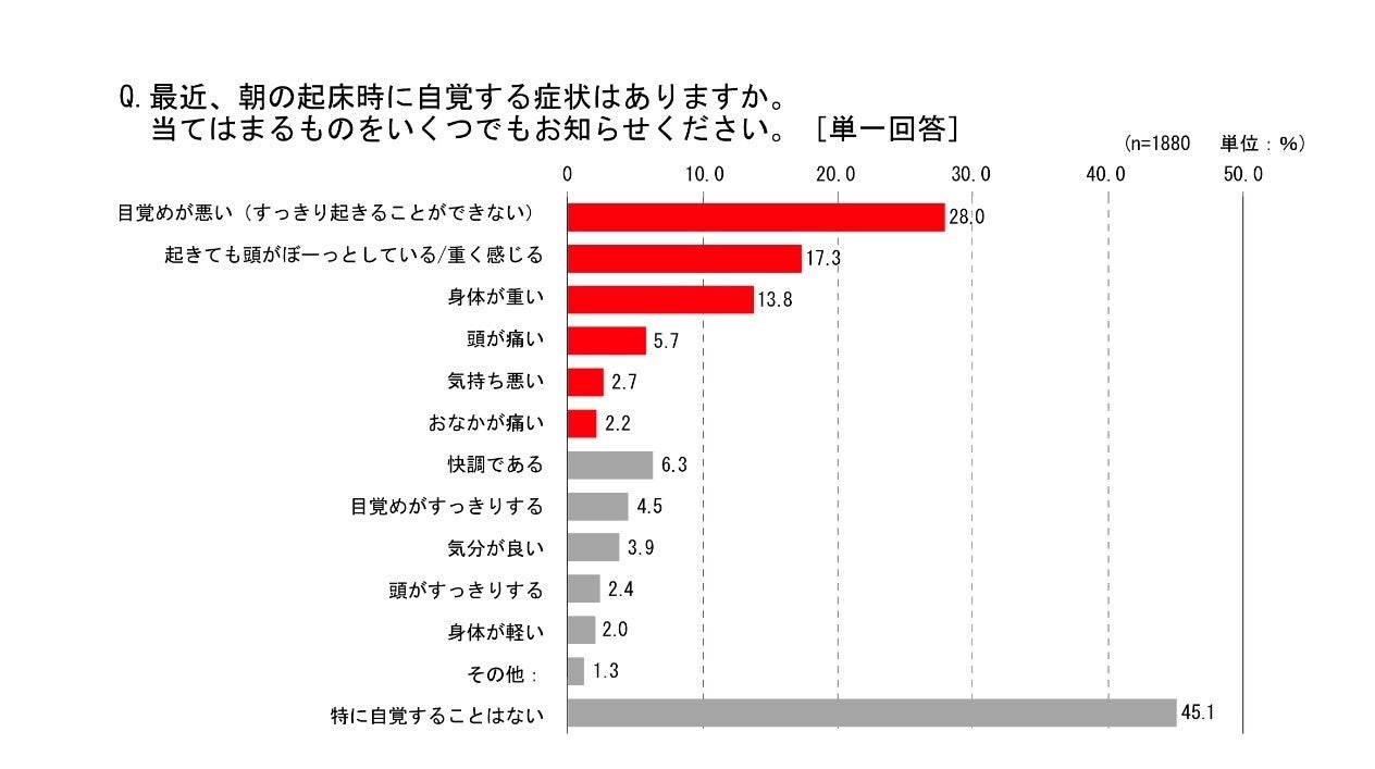 ■朝の起床時に自覚する症状として、目覚めが悪いと回答した人が28.0%。起きても頭がぼーっとしている/重く感じると回答した人は17.3%という結果に。