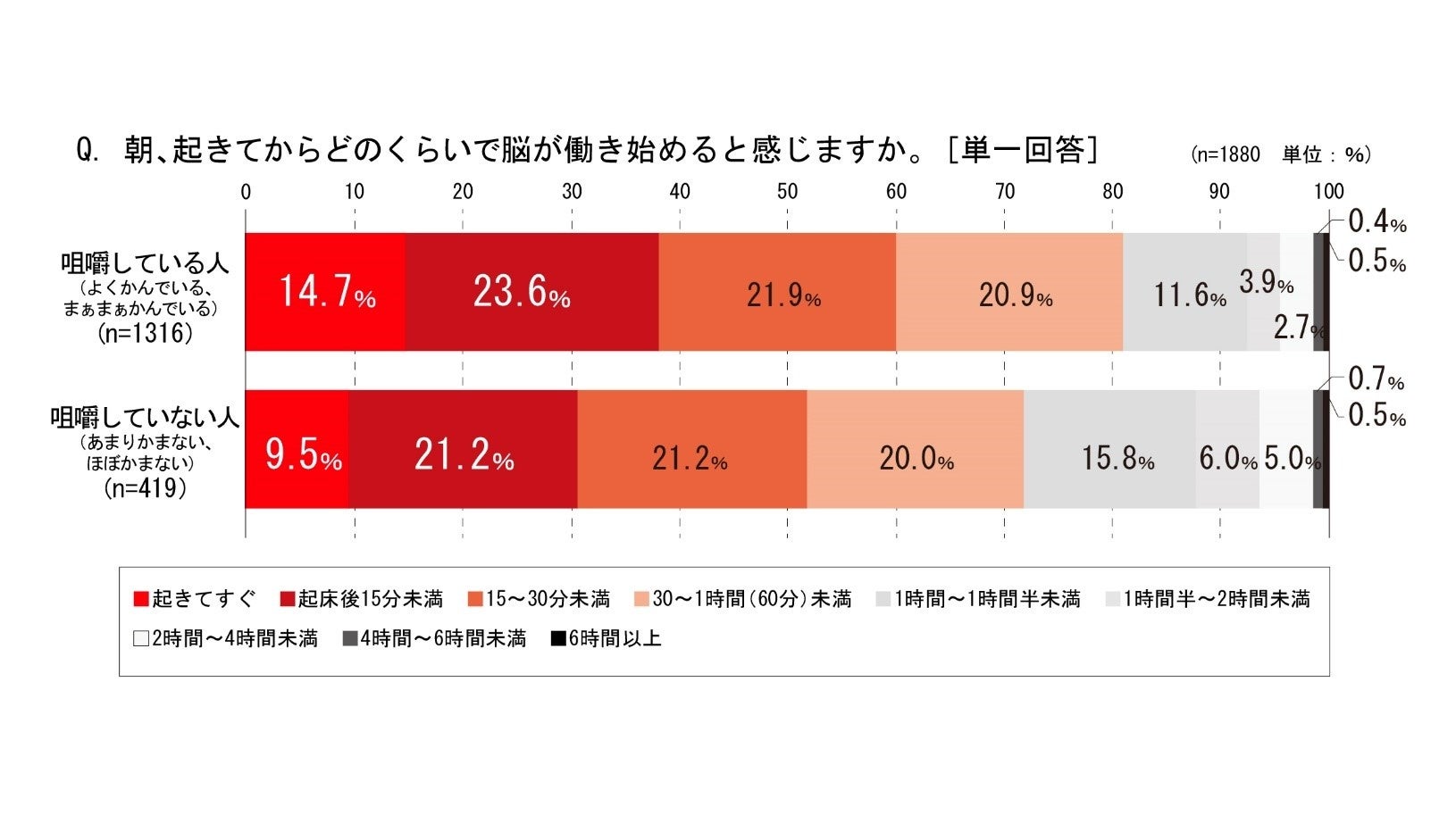 起床後の行動時間について、朝起きてからどのくらいで脳が働き始めるかという設問に対し、朝食を噛んで食べる、咀嚼派 (よくかんでいる、まあまあかんでいる、以下咀嚼派)(75.9%)の人のうち81.1%が「起床後1時間未満で脳が働き始める」と回答しました。朝食に咀嚼して食べている人の方が、脳が活性化され、より早くに脳が目覚めることができるという傾向にあるようです。