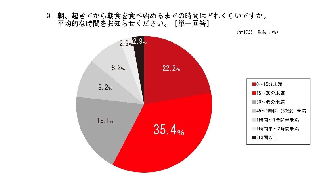 ■朝食を食べるタイミングは、朝起きてから15~30分未満が約35%。起床後30分未満に朝食を食べるのは全体の半数を超える結果に。