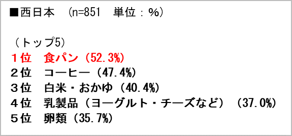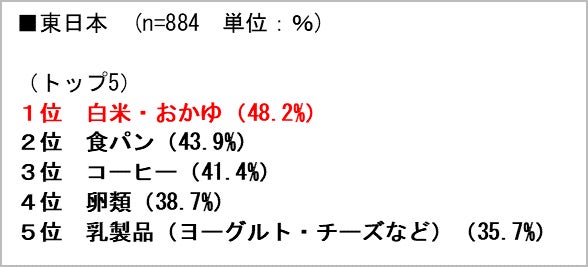 ■食パンや白米・おかゆやの次によく摂っているものは、コーヒー・卵類・乳製品。日本全国で見ると、東日本は白米・おかゆで西日本は食パンが主流な傾向に
