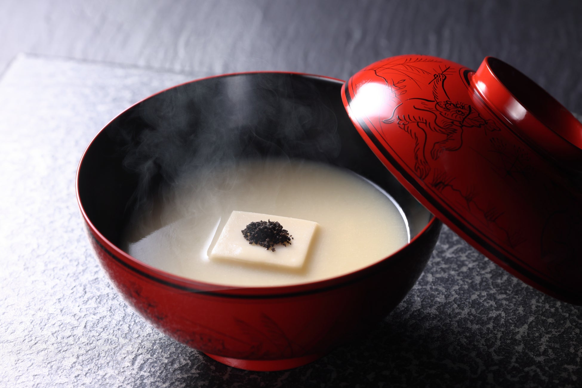 ふぐを最大限に味わってほしいという思いから生まれた、ふぐの身、皮、骨、頭を余すことなく使用した贅沢な一品です。ふぐは白ワイン、白味噌、昆布出汁等と合わせ摺流しに仕立てています。大徳寺納豆の風味を感じさせる黒オリーブパウダーの酸味がアクセントになり、ふぐ本来の甘みや旨味をより引き立たせます。