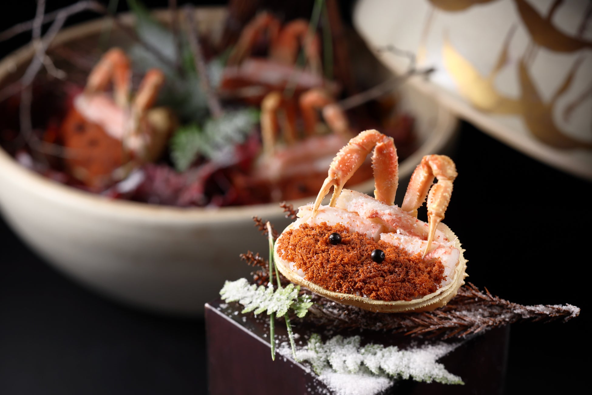 プーアル茶で炊いたお米に、香箱蟹(*4)の内子とほぐし身を混ぜ合わせ、紹興酒で酒蒸しにした身と外子をのせました。旨味が強い内子は鶏卵や紹興酒等を合わせたソースで楽しめます。香り高く、蟹の旨味を存分に楽しめる蒸し寿司です。