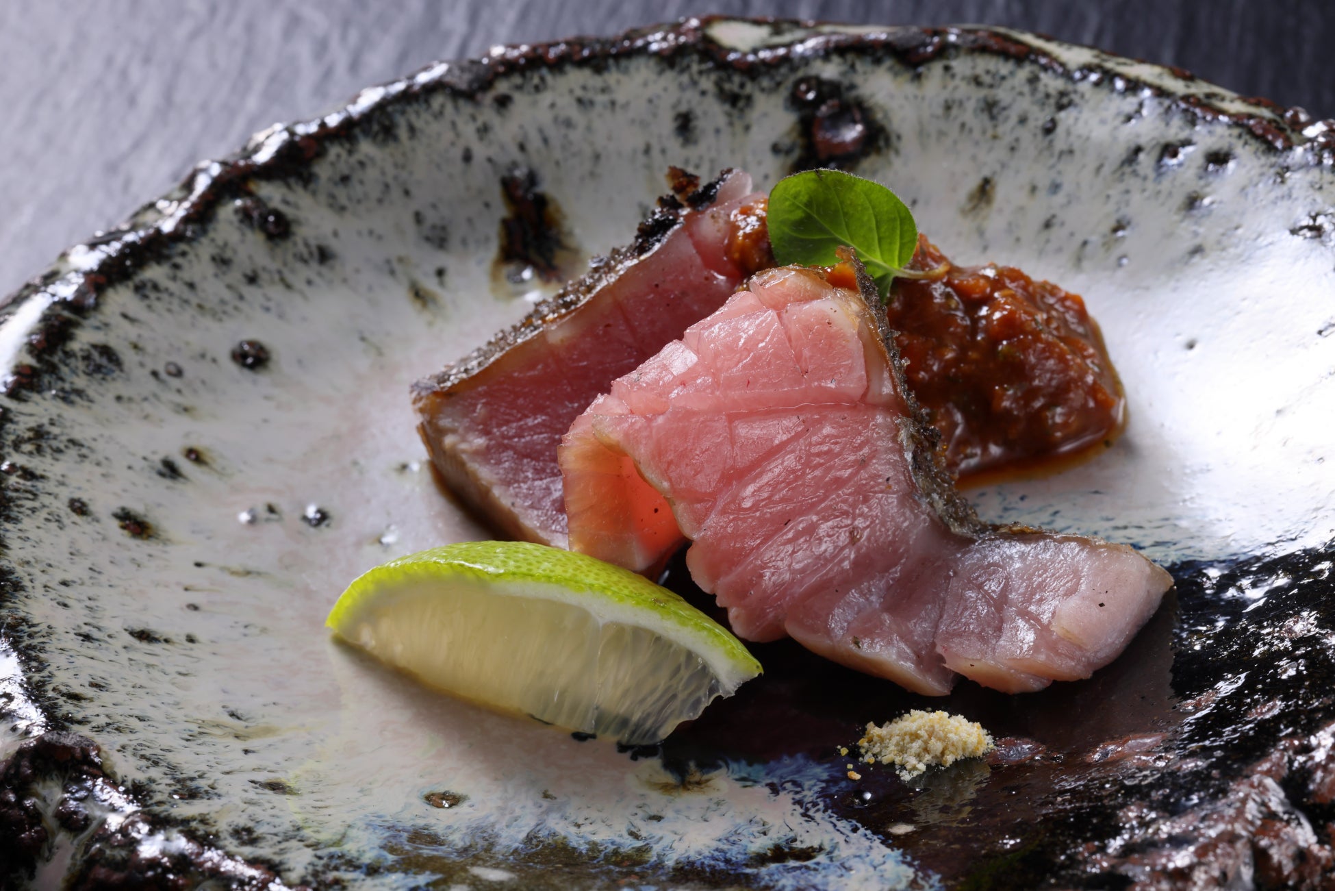 藁焼きで香りをつけたひっさげ(*3)を、金山寺味噌と檸檬の皮で作った檸檬塩で味わいます。脂ののったひっさげに合わせる金山寺味噌は、相性の良いオレガノや檸檬汁、セミドライトマトを加えることで、深みのある味の中に爽やかな香りを感じられるよう仕立てました。藁焼きに使用されることが多いポン酢からヒントを得て完成した、王道でありながら遊び心を取り入れた一品です。