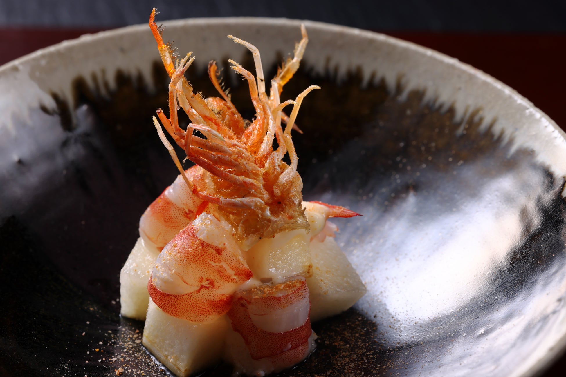 車海老を油霜(*2)にして甘みを引き立たせ、洋梨と酪を合わせました。土佐酢風味のジュレ、殻や頭を丸ごと砕いた海老塩を加えることによって、さっぱりとした酸味と共に海老の風味や旨味が存分に楽しめます。食材を余すことなく使用する日本料理の精神を大切にしながら、フランス料理によく使用される相性の良い食材をかけ合わせて完成した他にはない一品です。