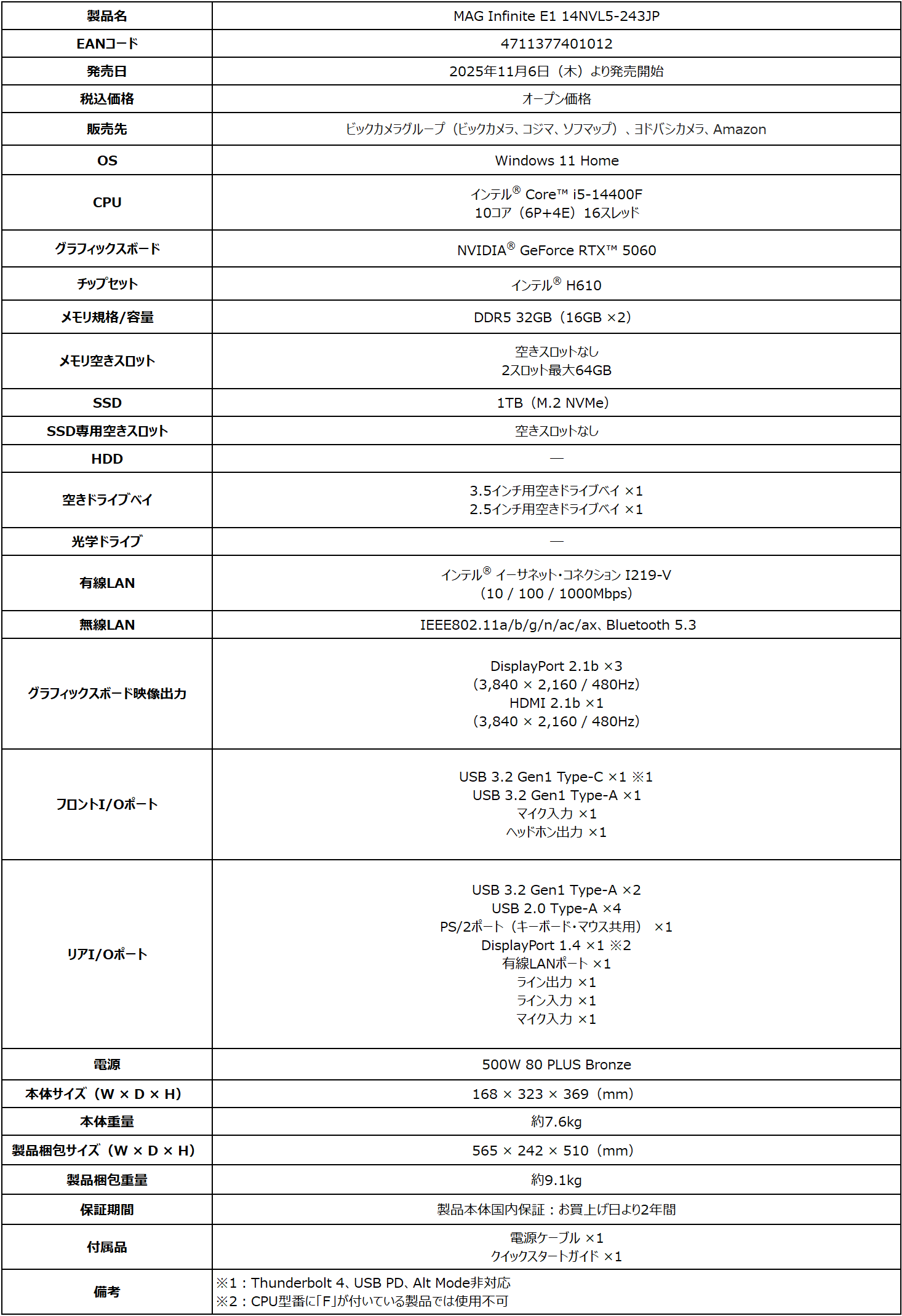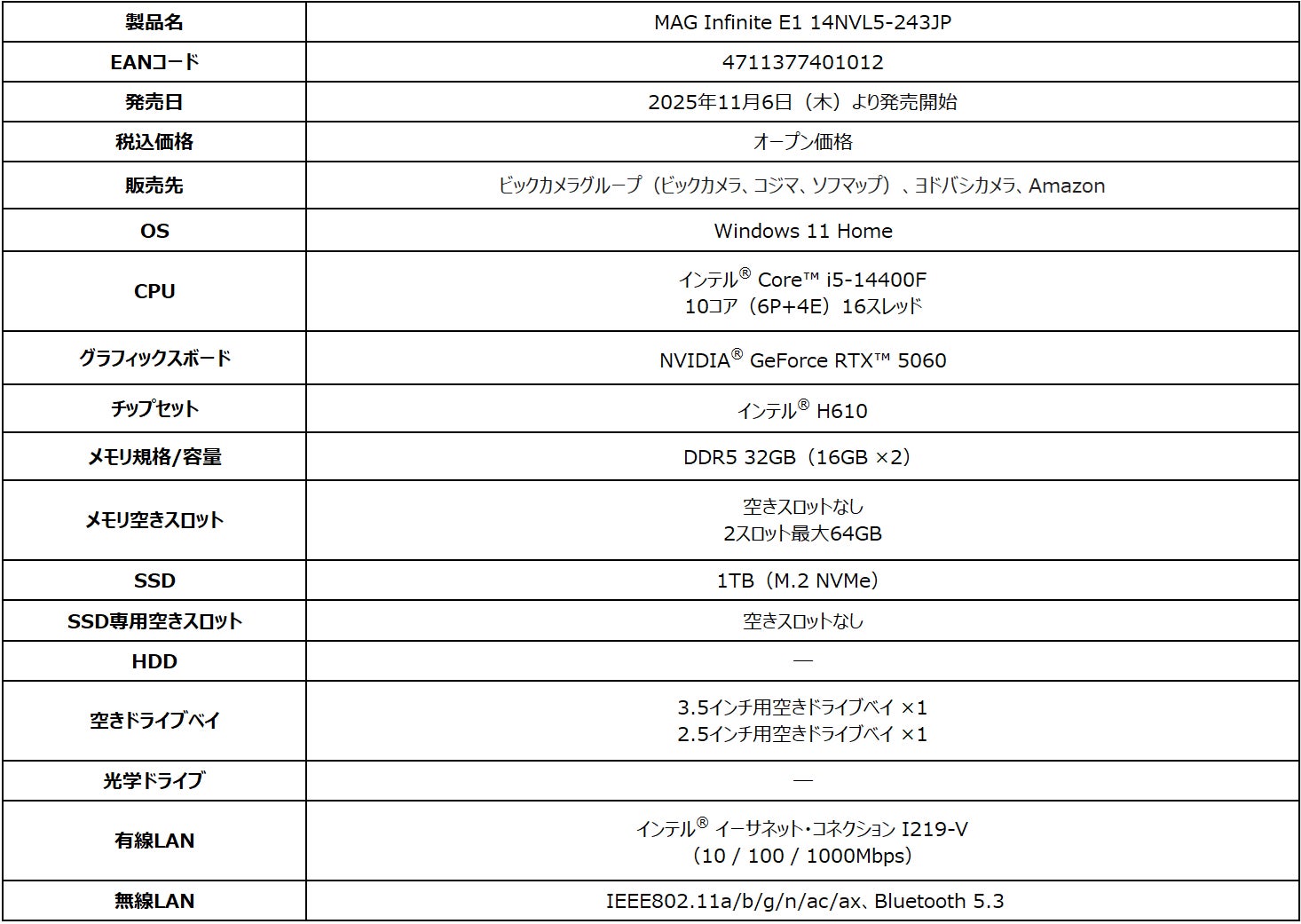 最新のゲーミング体験が得られるDLSS 4マルチフレーム生成に対応したNVIDIA® GeForce RTX™ 5060を搭載の、より高いフレームレートでのゲームプレイを実現し、大容量32GBメモリ、有線LAN・Wi-Fi 6E対応で設置環境を選ばず、コストパフォーマンスにも優れた「MAG Infinite E1 14NVL5-243JP」が新たにラインナップに加わります。