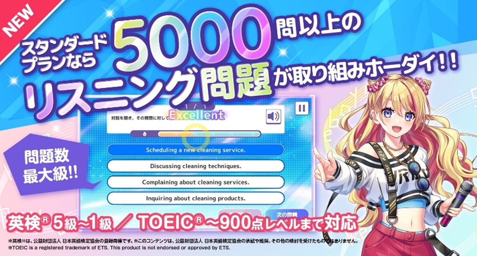 9月中旬に新機能「リスニング」が搭載されます。英検®5級~1級レベル、TOEIC®900点レベルまで対応した実戦形式で、5000問以上を出題します。