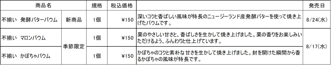 無印良品を展開する株式会社良品計画(東京都豊島区/代表取締役社長 堂前 宣夫)は、焼きムラや変形など、おいしさに関係なくはじかれていたものも生かした“不揃いバウム”の新商品「不揃い 発酵バターバウム」を8月24日(水)から、その他の季節限定バウム2アイテムを8月17日(水)から全国の無印良品で発売します。