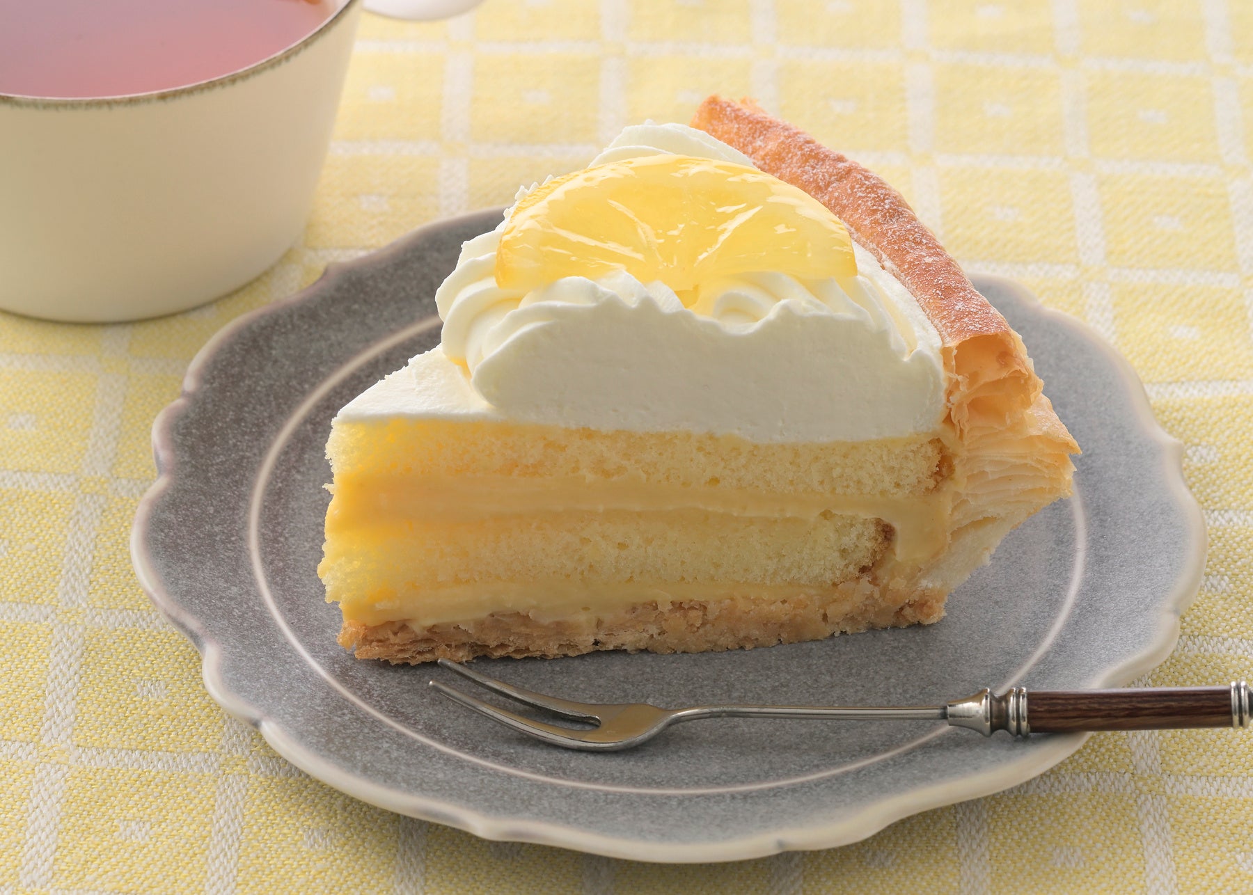 風味豊かなパイに、スポンジとまろやかな酸味のレモンチーズカスタードを重ねました。上面には乳味と酸味をきかせたレモンクリームを絞り、レモンスライスシロップ漬けをトッピング。