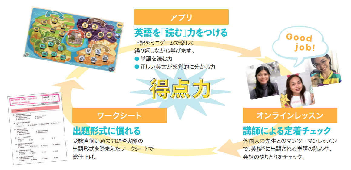 本講座では、「アプリ」「オンラインレッスン」「ワークシート」の3部構成になっており、文字や、頻出の英単語や文章に繰り返し、何度も触れていただくことで、お子さまが耳から聞いた英語の文字に結び付けるスピードを上げ、本番の試験での得点力アップに繋げられるようなレッスンの流れになっています。